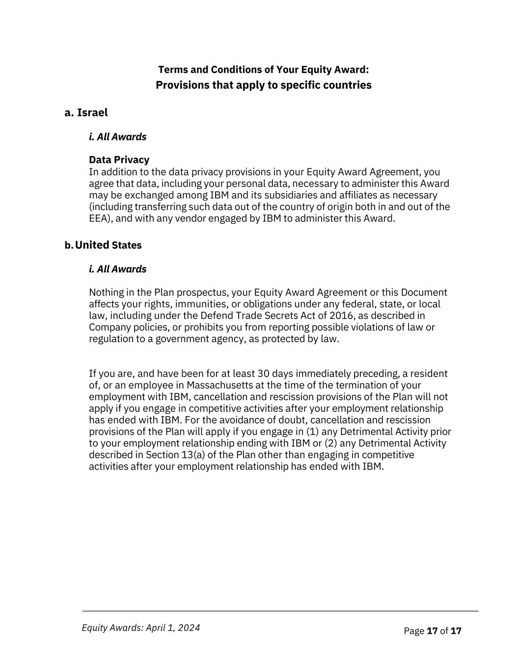 Equity Awards: April 1, 2024 Page 17 of 17 Terms and Conditions of Your Equity Award: Provisions that apply to specific countries a. Israel i. All Awards Data Privacy In addition to the data privacy provisions in your Equity Award Agreement, you agree that data, including your personal data, necessary to administer this Award may be exchanged among IBM and its subsidiaries and affiliates as necessary (including transferring such data out of the country of origin both in and out of the EEA), and with any vendor engaged by IBM to administer this Award. b. United States i. All Awards Nothing in the Plan prospectus, your Equity Award Agreement or this Document affects your rights, immunities, or obligations under any federal, state, or local law, including under the Defend Trade Secrets Act of 2016, as described in Company policies, or prohibits you from reporting possible violations of law or regulation to a government agency, as protected by law. If you are, and have been for at least 30 days immediately preceding, a resident of, or an employee in Massachusetts at the time of the termination of your employment with IBM, cancellation and rescission provisions of the Plan will not apply if you engage in competitive activities after your employment relationship has ended with IBM. For the avoidance of doubt, cancellation and rescission provisions of the Plan will apply if you engage in (1) any Detrimental Activity prior to your employment relationship ending with IBM or (2) any Detrimental Activity described in Section 13(a) of the Plan other than engaging in competitive activities after your employment relationship has ended with IBM.