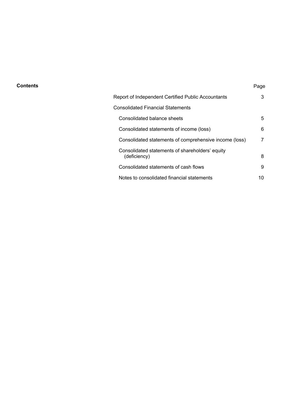 Contents Page Report of Independent Certified Public Accountants 3 Consolidated Financial Statements Consolidated balance sheets 5 Consolidated statements of income (loss) 6 Consolidated statements of comprehensive income (loss) 7 Consolidated statements of shareholders’ equity (deficiency) 8 Consolidated statements of cash flows 9 Notes to consolidated financial statements 10