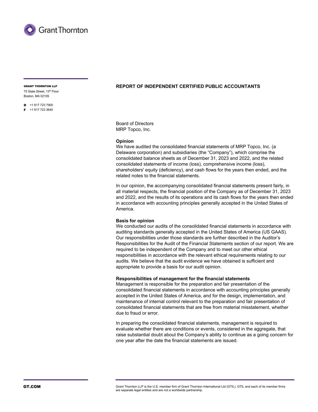 GT.COM Grant Thornton LLP is the U.S. member firm of Grant Thornton International Ltd (GTIL). GTIL and each of its member firms are separate legal entities and are not a worldwide partnership. Board of Directors MRP Topco, Inc. Opinion We have audited the consolidated financial statements of MRP Topco, Inc. (a Delaware corporation) and subsidiaries (the “Company”), which comprise the consolidated balance sheets as of December 31, 2023 and 2022, and the related consolidated statements of income (loss), comprehensive income (loss), shareholders' equity (deficiency), and cash flows for the years then ended, and the related notes to the financial statements. In our opinion, the accompanying consolidated financial statements present fairly, in all material respects, the financial position of the Company as of December 31, 2023 and 2022, and the results of its operations and its cash flows for the years then ended in accordance with accounting principles generally accepted in the United States of America. Basis for opinion We conducted our audits of the consolidated financial statements in accordance with auditing standards generally accepted in the United States of America (US GAAS). Our responsibilities under those standards are further described in the Auditor’s Responsibilities for the Audit of the Financial Statements section of our report. We are required to be independent of the Company and to meet our other ethical responsibilities in accordance with the relevant ethical requirements relating to our audits. We believe that the audit evidence we have obtained is sufficient and appropriate to provide a basis for our audit opinion. Responsibilities of management for the financial statements Management is responsible for the preparation and fair presentation of the consolidated financial statements in accordance with accounting principles generally accepted in the United States of America, and for the design, implementation, and maintenance of internal control relevant to the preparation and fair presentation of consolidated financial statements that are free from material misstatement, whether due to fraud or error. In preparing the consolidated financial statements, management is required to evaluate whether there are conditions or events, considered in the aggregate, that raise substantial doubt about the Company’s ability to continue as a going concern for one year after the date the financial statements are issued. REPORT OF INDEPENDENT CERTIFIED PUBLIC ACCOUNTANTS GRANT THORNTON LLP 75 State Street, 13th Floor Boston, MA 02109 D +1 617 723 7900 F +1 617 723 3640