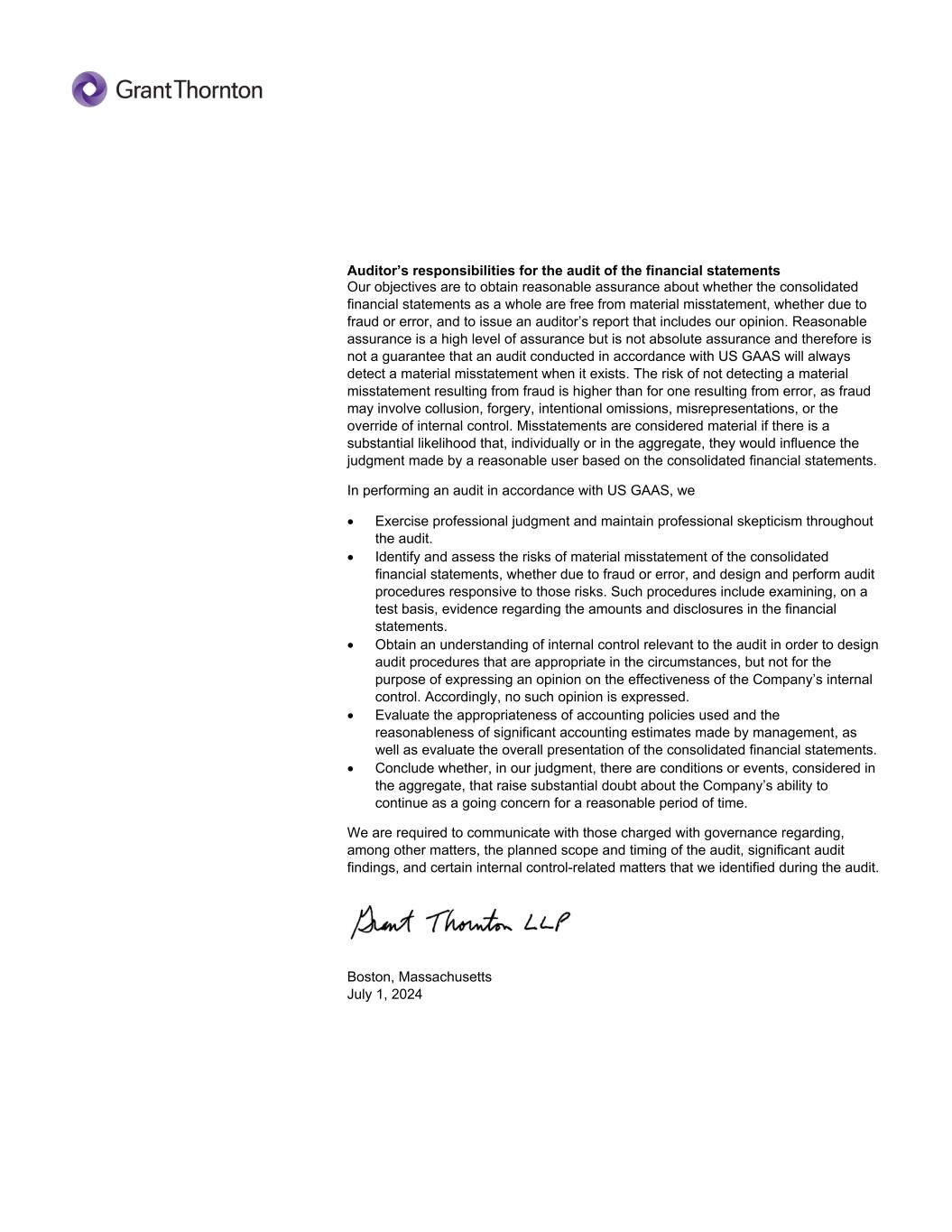 Auditor’s responsibilities for the audit of the financial statements Our objectives are to obtain reasonable assurance about whether the consolidated financial statements as a whole are free from material misstatement, whether due to fraud or error, and to issue an auditor’s report that includes our opinion. Reasonable assurance is a high level of assurance but is not absolute assurance and therefore is not a guarantee that an audit conducted in accordance with US GAAS will always detect a material misstatement when it exists. The risk of not detecting a material misstatement resulting from fraud is higher than for one resulting from error, as fraud may involve collusion, forgery, intentional omissions, misrepresentations, or the override of internal control. Misstatements are considered material if there is a substantial likelihood that, individually or in the aggregate, they would influence the judgment made by a reasonable user based on the consolidated financial statements. In performing an audit in accordance with US GAAS, we Exercise professional judgment and maintain professional skepticism throughout the audit. Identify and assess the risks of material misstatement of the consolidated financial statements, whether due to fraud or error, and design and perform audit procedures responsive to those risks. Such procedures include examining, on a test basis, evidence regarding the amounts and disclosures in the financial statements. Obtain an understanding of internal control relevant to the audit in order to design audit procedures that are appropriate in the circumstances, but not for the purpose of expressing an opinion on the effectiveness of the Company’s internal control. Accordingly, no such opinion is expressed. Evaluate the appropriateness of accounting policies used and the reasonableness of significant accounting estimates made by management, as well as evaluate the overall presentation of the consolidated financial statements. Conclude whether, in our judgment, there are conditions or events, considered in the aggregate, that raise substantial doubt about the Company’s ability to continue as a going concern for a reasonable period of time. We are required to communicate with those charged with governance regarding, among other matters, the planned scope and timing of the audit, significant audit findings, and certain internal control-related matters that we identified during the audit. Boston, Massachusetts July 1, 2024