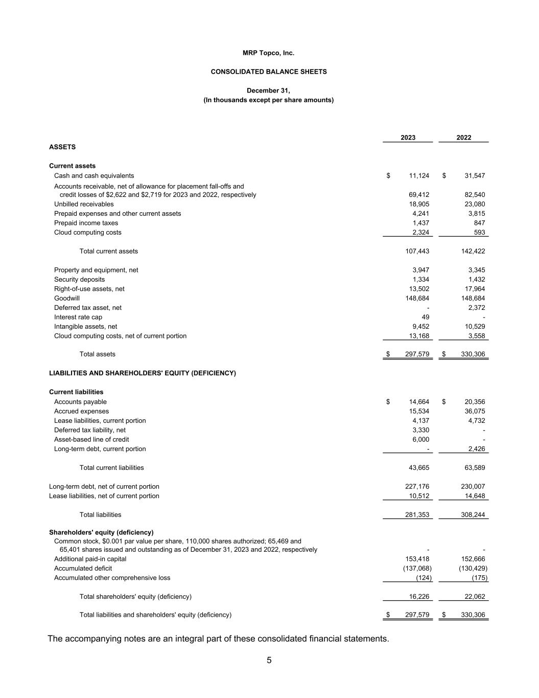 2023 2022 ASSETS Current assets Cash and cash equivalents 11,124$ 31,547$ Accounts receivable, net of allowance for placement fall-offs and credit losses of $2,622 and $2,719 for 2023 and 2022, respectively 69,412 82,540 Unbilled receivables 18,905 23,080 Prepaid expenses and other current assets 4,241 3,815 Prepaid income taxes 1,437 847 Cloud computing costs 2,324 593 Total current assets 107,443 142,422 Property and equipment, net 3,947 3,345 Security deposits 1,334 1,432 Right-of-use assets, net 13,502 17,964 Goodwill 148,684 148,684 Deferred tax asset, net - 2,372 Interest rate cap 49 - Intangible assets, net 9,452 10,529 Cloud computing costs, net of current portion 13,168 3,558 Total assets 297,579$ 330,306$ LIABILITIES AND SHAREHOLDERS' EQUITY (DEFICIENCY) Current liabilities Accounts payable 14,664$ 20,356$ Accrued expenses 15,534 36,075 Lease liabilities, current portion 4,137 4,732 Deferred tax liability, net 3,330 - Asset-based line of credit 6,000 - Long-term debt, current portion - 2,426 Total current liabilities 43,665 63,589 Long-term debt, net of current portion 227,176 230,007 Lease liabilities, net of current portion 10,512 14,648 Total liabilities 281,353 308,244 Shareholders' equity (deficiency) Common stock, $0.001 par value per share, 110,000 shares authorized; 65,469 and 65,401 shares issued and outstanding as of December 31, 2023 and 2022, respectively - - Additional paid-in capital 153,418 152,666 Accumulated deficit (137,068) (130,429) Accumulated other comprehensive loss (124) (175) Total shareholders' equity (deficiency) 16,226 22,062 Total liabilities and shareholders' equity (deficiency) 297,579$ 330,306$ MRP Topco, Inc. CONSOLIDATED BALANCE SHEETS December 31, (In thousands except per share amounts) The accompanying notes are an integral part of these consolidated financial statements. 5