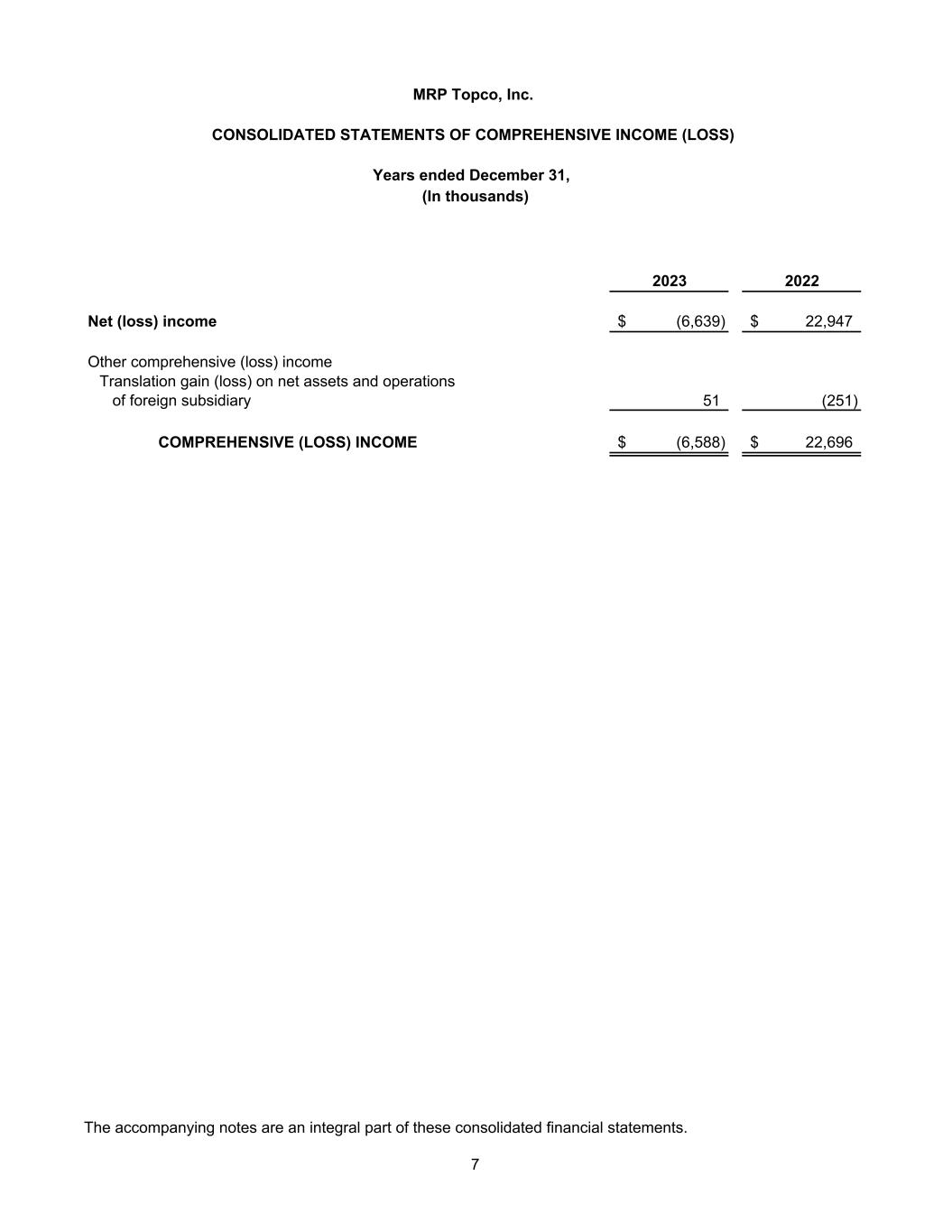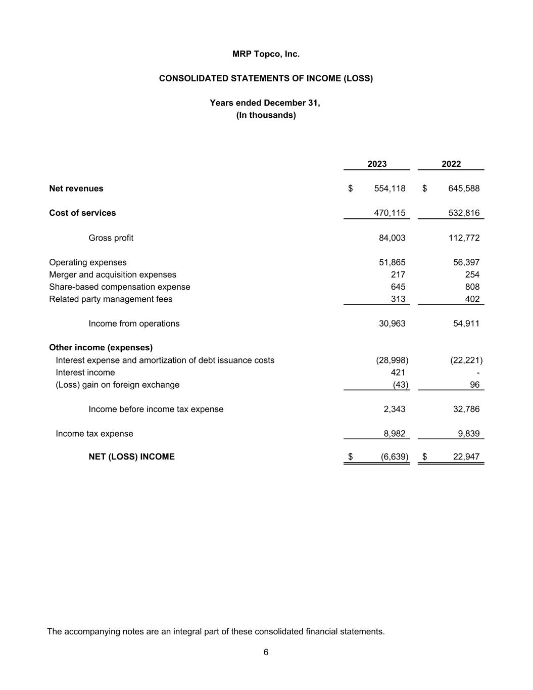 2023 2022 Net revenues 554,118$ 645,588$ Cost of services 470,115 532,816 Gross profit 84,003 112,772 Operating expenses 51,865 56,397 Merger and acquisition expenses 217 254 Share-based compensation expense 645 808 Related party management fees 313 402 Income from operations 30,963 54,911 Other income (expenses) Interest expense and amortization of debt issuance costs (28,998) (22,221) Interest income 421 - (Loss) gain on foreign exchange (43) 96 Income before income tax expense 2,343 32,786 Income tax expense 8,982 9,839 NET (LOSS) INCOME (6,639)$ 22,947$ (In thousands) Years ended December 31, CONSOLIDATED STATEMENTS OF INCOME (LOSS) MRP Topco, Inc. The accompanying notes are an integral part of these consolidated financial statements. 6