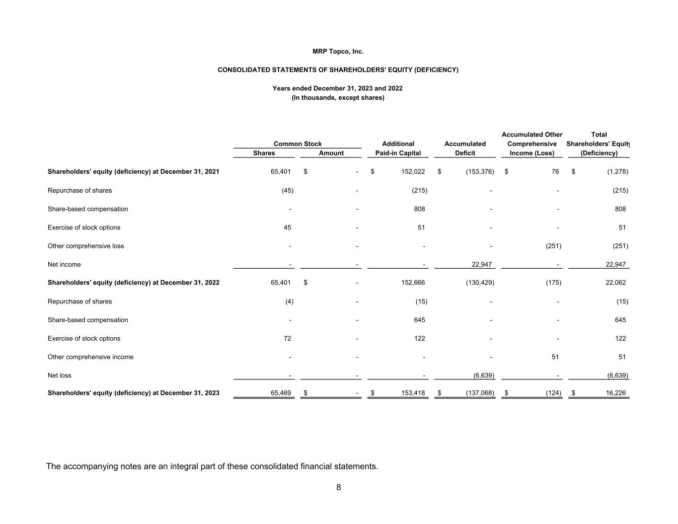 Accumulated Other Total Additional Accumulated Comprehensive Shareholders' Equity Shares Amount Paid-in Capital Deficit Income (Loss) (Deficiency) Shareholders' equity (deficiency) at December 31, 2021 65,401 -$ 152,022$ (153,376)$ 76$ (1,278)$ Repurchase of shares (45) - (215) - - (215) Share-based compensation - - 808 - - 808 Exercise of stock options 45 - 51 - - 51 Other comprehensive loss - - - - (251) (251) Net income - - - 22,947 - 22,947 Shareholders' equity (deficiency) at December 31, 2022 65,401 -$ 152,666 (130,429) (175) 22,062 Repurchase of shares (4) - (15) - - (15) Share-based compensation - - 645 - - 645 Exercise of stock options 72 - 122 - - 122 Other comprehensive income - - - - 51 51 Net loss - - - (6,639) - (6,639) Shareholders' equity (deficiency) at December 31, 2023 65,469 -$ 153,418$ (137,068)$ (124)$ 16,226$ MRP Topco, Inc. CONSOLIDATED STATEMENTS OF SHAREHOLDERS' EQUITY (DEFICIENCY) Years ended December 31, 2023 and 2022 (In thousands, except shares) Common Stock The accompanying notes are an integral part of these consolidated financial statements. 8