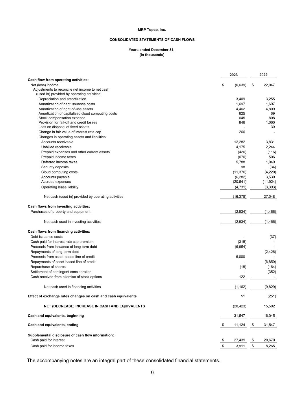 2023 2022 Cash flow from operating activities: Net (loss) income (6,639)$ 22,947$ Adjustments to reconcile net income to net cash (used in) provided by operating activities: Depreciation and amortization 3,409 3,255 Amortization of debt issuance costs 1,697 1,697 Amortization of right-of-use assets 4,462 4,809 Amortization of capitalized cloud computing costs 625 69 Stock compensation expense 645 808 Provision for fall-off and credit losses 846 1,060 Loss on disposal of fixed assets - 30 Change in fair value of interest rate cap 266 - Changes in operating assets and liabilities: Accounts receivable 12,282 3,831 Unbilled receivable 4,175 2,244 Prepaid expenses and other current assets (426) (116) Prepaid income taxes (676) 506 Deferred income taxes 5,788 1,949 Security deposits 98 (34) Cloud computing costs (11,376) (4,220) Accounts payable (6,282) 3,530 Accrued expenses (20,541) (11,924) Operating lease liability (4,731) (3,393) Net cash (used in) provided by operating activities (16,378) 27,048 Cash flows from investing activities: Purchases of property and equipment (2,934) (1,466) Net cash used in investing activities (2,934) (1,466) Cash flows from financing activities: Debt issuance costs - (37) Cash paid for interest rate cap premium (315) - Proceeds from issuance of long term debt (6,954) - Repayments of long-term debt - (2,426) Proceeds from asset-based line of credit 6,000 - Repayments of asset-based line of credit - (6,850) Repurchase of shares (15) (164) Settlement of contingent consideration - (352) Cash received from exercise of stock options 122 - Net cash used in financing activities (1,162) (9,829) Effect of exchange rates changes on cash and cash equivalents 51 (251) NET (DECREASE) INCREASE IN CASH AND EQUIVALENTS (20,423) 15,502 Cash and equivalents, beginning 31,547 16,045 Cash and equivalents, ending 11,124$ 31,547$ Supplemental disclosure of cash flow information: Cash paid for interest 27,439$ 20,670$ Cash paid for income taxes 3,911$ 8,265$ MRP Topco, Inc. CONSOLIDATED STATEMENTS OF CASH FLOWS Years ended December 31, (In thousands) The accompanying notes are an integral part of these consolidated financial statements. 9