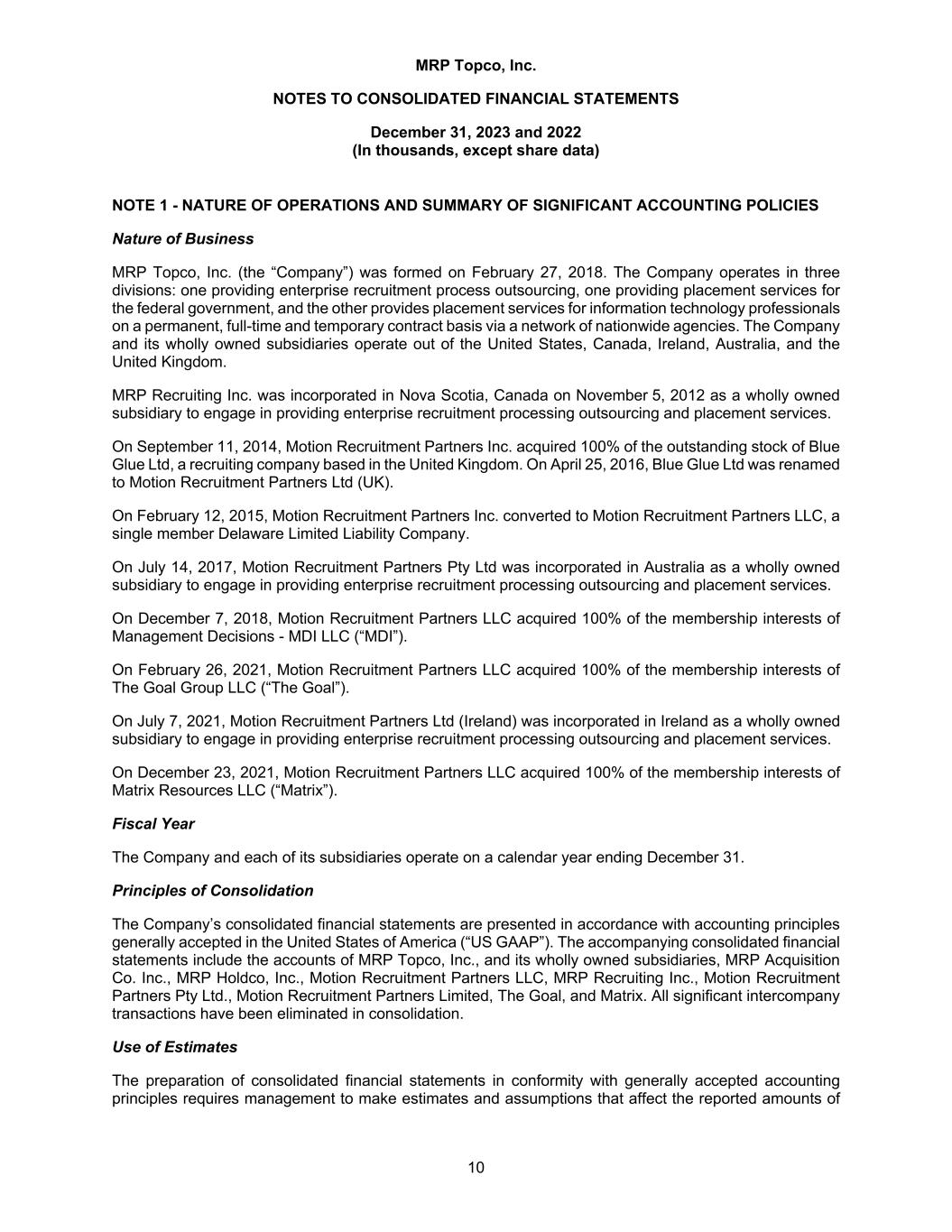 MRP Topco, Inc. NOTES TO CONSOLIDATED FINANCIAL STATEMENTS December 31, 2023 and 2022 (In thousands, except share data) 10 NOTE 1 - NATURE OF OPERATIONS AND SUMMARY OF SIGNIFICANT ACCOUNTING POLICIES Nature of Business MRP Topco, Inc. (the “Company”) was formed on February 27, 2018. The Company operates in three divisions: one providing enterprise recruitment process outsourcing, one providing placement services for the federal government, and the other provides placement services for information technology professionals on a permanent, full-time and temporary contract basis via a network of nationwide agencies. The Company and its wholly owned subsidiaries operate out of the United States, Canada, Ireland, Australia, and the United Kingdom. MRP Recruiting Inc. was incorporated in Nova Scotia, Canada on November 5, 2012 as a wholly owned subsidiary to engage in providing enterprise recruitment processing outsourcing and placement services. On September 11, 2014, Motion Recruitment Partners Inc. acquired 100% of the outstanding stock of Blue Glue Ltd, a recruiting company based in the United Kingdom. On April 25, 2016, Blue Glue Ltd was renamed to Motion Recruitment Partners Ltd (UK). On February 12, 2015, Motion Recruitment Partners Inc. converted to Motion Recruitment Partners LLC, a single member Delaware Limited Liability Company. On July 14, 2017, Motion Recruitment Partners Pty Ltd was incorporated in Australia as a wholly owned subsidiary to engage in providing enterprise recruitment processing outsourcing and placement services. On December 7, 2018, Motion Recruitment Partners LLC acquired 100% of the membership interests of Management Decisions - MDI LLC (“MDI”). On February 26, 2021, Motion Recruitment Partners LLC acquired 100% of the membership interests of The Goal Group LLC (“The Goal”). On July 7, 2021, Motion Recruitment Partners Ltd (Ireland) was incorporated in Ireland as a wholly owned subsidiary to engage in providing enterprise recruitment processing outsourcing and placement services. On December 23, 2021, Motion Recruitment Partners LLC acquired 100% of the membership interests of Matrix Resources LLC (“Matrix”). Fiscal Year The Company and each of its subsidiaries operate on a calendar year ending December 31. Principles of Consolidation The Company’s consolidated financial statements are presented in accordance with accounting principles generally accepted in the United States of America (“US GAAP”). The accompanying consolidated financial statements include the accounts of MRP Topco, Inc., and its wholly owned subsidiaries, MRP Acquisition Co. Inc., MRP Holdco, Inc., Motion Recruitment Partners LLC, MRP Recruiting Inc., Motion Recruitment Partners Pty Ltd., Motion Recruitment Partners Limited, The Goal, and Matrix. All significant intercompany transactions have been eliminated in consolidation. Use of Estimates The preparation of consolidated financial statements in conformity with generally accepted accounting principles requires management to make estimates and assumptions that affect the reported amounts of