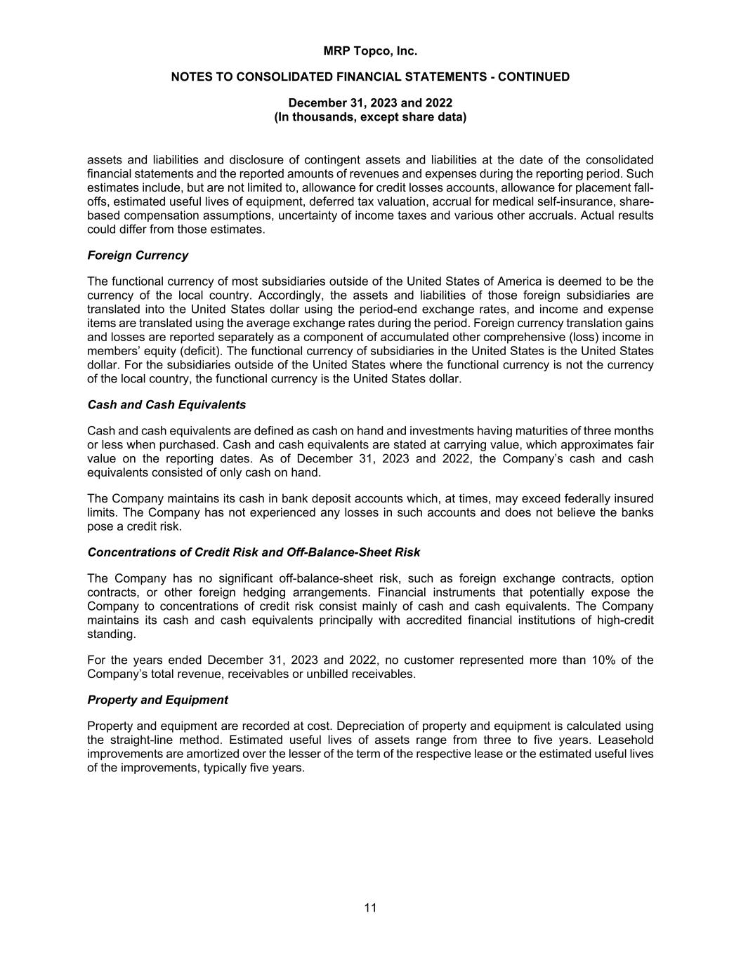 MRP Topco, Inc. NOTES TO CONSOLIDATED FINANCIAL STATEMENTS - CONTINUED December 31, 2023 and 2022 (In thousands, except share data) 11 assets and liabilities and disclosure of contingent assets and liabilities at the date of the consolidated financial statements and the reported amounts of revenues and expenses during the reporting period. Such estimates include, but are not limited to, allowance for credit losses accounts, allowance for placement fall- offs, estimated useful lives of equipment, deferred tax valuation, accrual for medical self-insurance, share- based compensation assumptions, uncertainty of income taxes and various other accruals. Actual results could differ from those estimates. Foreign Currency The functional currency of most subsidiaries outside of the United States of America is deemed to be the currency of the local country. Accordingly, the assets and liabilities of those foreign subsidiaries are translated into the United States dollar using the period-end exchange rates, and income and expense items are translated using the average exchange rates during the period. Foreign currency translation gains and losses are reported separately as a component of accumulated other comprehensive (loss) income in members’ equity (deficit). The functional currency of subsidiaries in the United States is the United States dollar. For the subsidiaries outside of the United States where the functional currency is not the currency of the local country, the functional currency is the United States dollar. Cash and Cash Equivalents Cash and cash equivalents are defined as cash on hand and investments having maturities of three months or less when purchased. Cash and cash equivalents are stated at carrying value, which approximates fair value on the reporting dates. As of December 31, 2023 and 2022, the Company’s cash and cash equivalents consisted of only cash on hand. The Company maintains its cash in bank deposit accounts which, at times, may exceed federally insured limits. The Company has not experienced any losses in such accounts and does not believe the banks pose a credit risk. Concentrations of Credit Risk and Off-Balance-Sheet Risk The Company has no significant off-balance-sheet risk, such as foreign exchange contracts, option contracts, or other foreign hedging arrangements. Financial instruments that potentially expose the Company to concentrations of credit risk consist mainly of cash and cash equivalents. The Company maintains its cash and cash equivalents principally with accredited financial institutions of high-credit standing. For the years ended December 31, 2023 and 2022, no customer represented more than 10% of the Company’s total revenue, receivables or unbilled receivables. Property and Equipment Property and equipment are recorded at cost. Depreciation of property and equipment is calculated using the straight-line method. Estimated useful lives of assets range from three to five years. Leasehold improvements are amortized over the lesser of the term of the respective lease or the estimated useful lives of the improvements, typically five years.