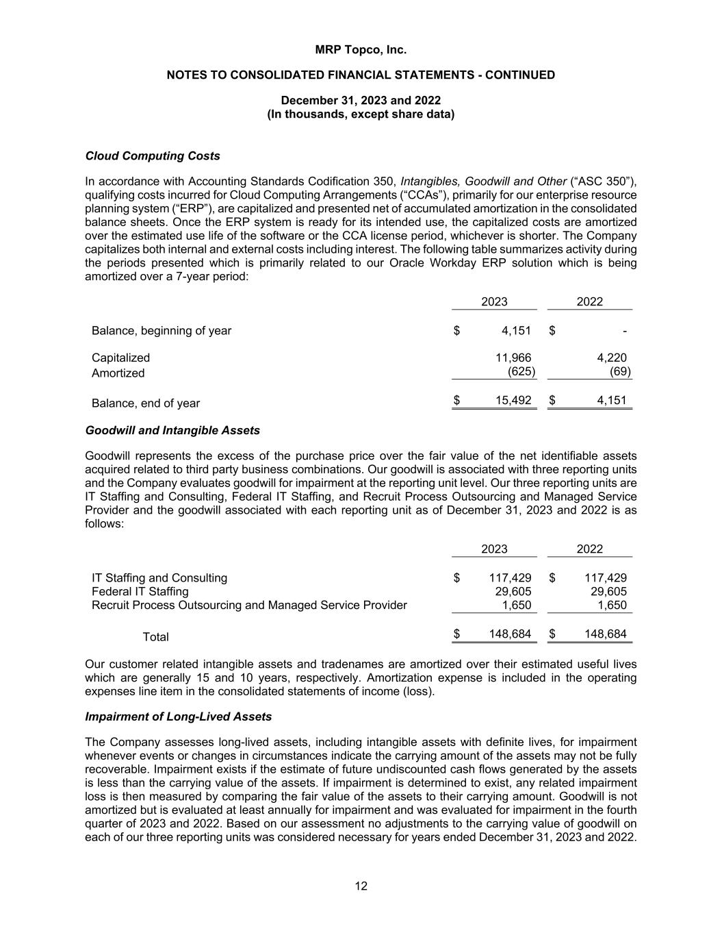 MRP Topco, Inc. NOTES TO CONSOLIDATED FINANCIAL STATEMENTS - CONTINUED December 31, 2023 and 2022 (In thousands, except share data) 12 Cloud Computing Costs In accordance with Accounting Standards Codification 350, Intangibles, Goodwill and Other (“ASC 350”), qualifying costs incurred for Cloud Computing Arrangements (“CCAs”), primarily for our enterprise resource planning system (“ERP”), are capitalized and presented net of accumulated amortization in the consolidated balance sheets. Once the ERP system is ready for its intended use, the capitalized costs are amortized over the estimated use life of the software or the CCA license period, whichever is shorter. The Company capitalizes both internal and external costs including interest. The following table summarizes activity during the periods presented which is primarily related to our Oracle Workday ERP solution which is being amortized over a 7-year period: 2023 2022 Balance, beginning of year $ 4,151 $ - Capitalized 11,966 4,220 Amortized (625) (69) Balance, end of year $ 15,492 $ 4,151 Goodwill and Intangible Assets Goodwill represents the excess of the purchase price over the fair value of the net identifiable assets acquired related to third party business combinations. Our goodwill is associated with three reporting units and the Company evaluates goodwill for impairment at the reporting unit level. Our three reporting units are IT Staffing and Consulting, Federal IT Staffing, and Recruit Process Outsourcing and Managed Service Provider and the goodwill associated with each reporting unit as of December 31, 2023 and 2022 is as follows: 2023 2022 IT Staffing and Consulting $ 117,429 $ 117,429 Federal IT Staffing 29,605 29,605 Recruit Process Outsourcing and Managed Service Provider 1,650 1,650 Total $ 148,684 $ 148,684 Our customer related intangible assets and tradenames are amortized over their estimated useful lives which are generally 15 and 10 years, respectively. Amortization expense is included in the operating expenses line item in the consolidated statements of income (loss). Impairment of Long-Lived Assets The Company assesses long-lived assets, including intangible assets with definite lives, for impairment whenever events or changes in circumstances indicate the carrying amount of the assets may not be fully recoverable. Impairment exists if the estimate of future undiscounted cash flows generated by the assets is less than the carrying value of the assets. If impairment is determined to exist, any related impairment loss is then measured by comparing the fair value of the assets to their carrying amount. Goodwill is not amortized but is evaluated at least annually for impairment and was evaluated for impairment in the fourth quarter of 2023 and 2022. Based on our assessment no adjustments to the carrying value of goodwill on each of our three reporting units was considered necessary for years ended December 31, 2023 and 2022.