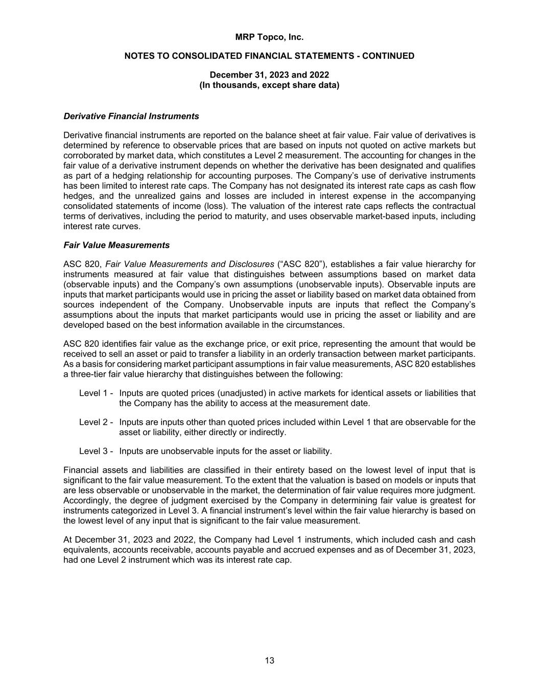 MRP Topco, Inc. NOTES TO CONSOLIDATED FINANCIAL STATEMENTS - CONTINUED December 31, 2023 and 2022 (In thousands, except share data) 13 Derivative Financial Instruments Derivative financial instruments are reported on the balance sheet at fair value. Fair value of derivatives is determined by reference to observable prices that are based on inputs not quoted on active markets but corroborated by market data, which constitutes a Level 2 measurement. The accounting for changes in the fair value of a derivative instrument depends on whether the derivative has been designated and qualifies as part of a hedging relationship for accounting purposes. The Company’s use of derivative instruments has been limited to interest rate caps. The Company has not designated its interest rate caps as cash flow hedges, and the unrealized gains and losses are included in interest expense in the accompanying consolidated statements of income (loss). The valuation of the interest rate caps reflects the contractual terms of derivatives, including the period to maturity, and uses observable market-based inputs, including interest rate curves. Fair Value Measurements ASC 820, Fair Value Measurements and Disclosures (“ASC 820”), establishes a fair value hierarchy for instruments measured at fair value that distinguishes between assumptions based on market data (observable inputs) and the Company’s own assumptions (unobservable inputs). Observable inputs are inputs that market participants would use in pricing the asset or liability based on market data obtained from sources independent of the Company. Unobservable inputs are inputs that reflect the Company’s assumptions about the inputs that market participants would use in pricing the asset or liability and are developed based on the best information available in the circumstances. ASC 820 identifies fair value as the exchange price, or exit price, representing the amount that would be received to sell an asset or paid to transfer a liability in an orderly transaction between market participants. As a basis for considering market participant assumptions in fair value measurements, ASC 820 establishes a three-tier fair value hierarchy that distinguishes between the following: Level 1 - Inputs are quoted prices (unadjusted) in active markets for identical assets or liabilities that the Company has the ability to access at the measurement date. Level 2 - Inputs are inputs other than quoted prices included within Level 1 that are observable for the asset or liability, either directly or indirectly. Level 3 - Inputs are unobservable inputs for the asset or liability. Financial assets and liabilities are classified in their entirety based on the lowest level of input that is significant to the fair value measurement. To the extent that the valuation is based on models or inputs that are less observable or unobservable in the market, the determination of fair value requires more judgment. Accordingly, the degree of judgment exercised by the Company in determining fair value is greatest for instruments categorized in Level 3. A financial instrument’s level within the fair value hierarchy is based on the lowest level of any input that is significant to the fair value measurement. At December 31, 2023 and 2022, the Company had Level 1 instruments, which included cash and cash equivalents, accounts receivable, accounts payable and accrued expenses and as of December 31, 2023, had one Level 2 instrument which was its interest rate cap.