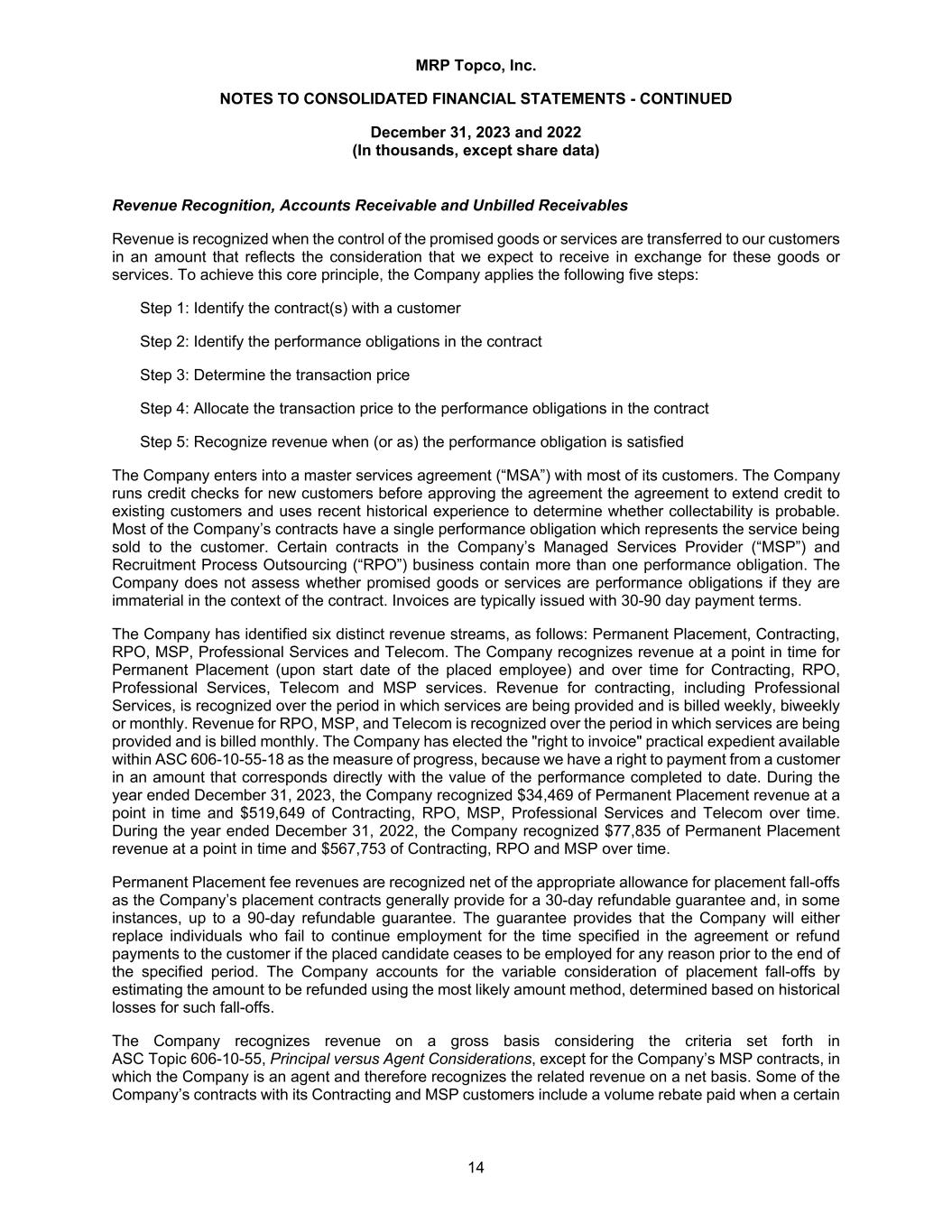 MRP Topco, Inc. NOTES TO CONSOLIDATED FINANCIAL STATEMENTS - CONTINUED December 31, 2023 and 2022 (In thousands, except share data) 14 Revenue Recognition, Accounts Receivable and Unbilled Receivables Revenue is recognized when the control of the promised goods or services are transferred to our customers in an amount that reflects the consideration that we expect to receive in exchange for these goods or services. To achieve this core principle, the Company applies the following five steps: Step 1: Identify the contract(s) with a customer Step 2: Identify the performance obligations in the contract Step 3: Determine the transaction price Step 4: Allocate the transaction price to the performance obligations in the contract Step 5: Recognize revenue when (or as) the performance obligation is satisfied The Company enters into a master services agreement (“MSA”) with most of its customers. The Company runs credit checks for new customers before approving the agreement the agreement to extend credit to existing customers and uses recent historical experience to determine whether collectability is probable. Most of the Company’s contracts have a single performance obligation which represents the service being sold to the customer. Certain contracts in the Company’s Managed Services Provider (“MSP”) and Recruitment Process Outsourcing (“RPO”) business contain more than one performance obligation. The Company does not assess whether promised goods or services are performance obligations if they are immaterial in the context of the contract. Invoices are typically issued with 30-90 day payment terms. The Company has identified six distinct revenue streams, as follows: Permanent Placement, Contracting, RPO, MSP, Professional Services and Telecom. The Company recognizes revenue at a point in time for Permanent Placement (upon start date of the placed employee) and over time for Contracting, RPO, Professional Services, Telecom and MSP services. Revenue for contracting, including Professional Services, is recognized over the period in which services are being provided and is billed weekly, biweekly or monthly. Revenue for RPO, MSP, and Telecom is recognized over the period in which services are being provided and is billed monthly. The Company has elected the "right to invoice" practical expedient available within ASC 606-10-55-18 as the measure of progress, because we have a right to payment from a customer in an amount that corresponds directly with the value of the performance completed to date. During the year ended December 31, 2023, the Company recognized $34,469 of Permanent Placement revenue at a point in time and $519,649 of Contracting, RPO, MSP, Professional Services and Telecom over time. During the year ended December 31, 2022, the Company recognized $77,835 of Permanent Placement revenue at a point in time and $567,753 of Contracting, RPO and MSP over time. Permanent Placement fee revenues are recognized net of the appropriate allowance for placement fall-offs as the Company’s placement contracts generally provide for a 30-day refundable guarantee and, in some instances, up to a 90-day refundable guarantee. The guarantee provides that the Company will either replace individuals who fail to continue employment for the time specified in the agreement or refund payments to the customer if the placed candidate ceases to be employed for any reason prior to the end of the specified period. The Company accounts for the variable consideration of placement fall-offs by estimating the amount to be refunded using the most likely amount method, determined based on historical losses for such fall-offs. The Company recognizes revenue on a gross basis considering the criteria set forth in ASC Topic 606-10-55, Principal versus Agent Considerations, except for the Company’s MSP contracts, in which the Company is an agent and therefore recognizes the related revenue on a net basis. Some of the Company’s contracts with its Contracting and MSP customers include a volume rebate paid when a certain
