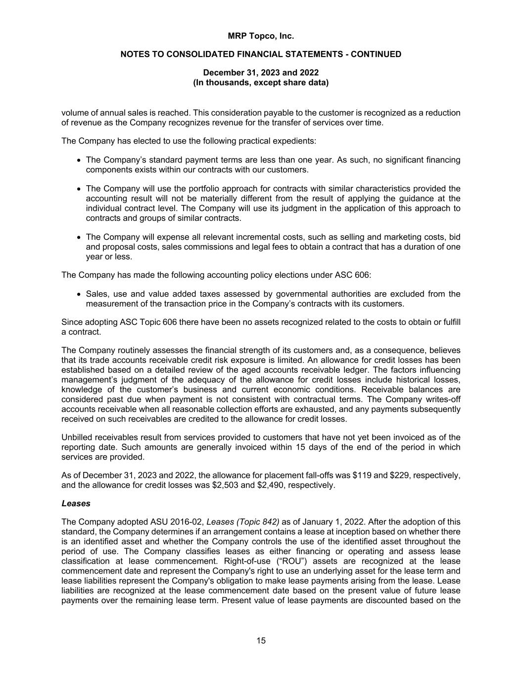 MRP Topco, Inc. NOTES TO CONSOLIDATED FINANCIAL STATEMENTS - CONTINUED December 31, 2023 and 2022 (In thousands, except share data) 15 volume of annual sales is reached. This consideration payable to the customer is recognized as a reduction of revenue as the Company recognizes revenue for the transfer of services over time. The Company has elected to use the following practical expedients: The Company’s standard payment terms are less than one year. As such, no significant financing components exists within our contracts with our customers. The Company will use the portfolio approach for contracts with similar characteristics provided the accounting result will not be materially different from the result of applying the guidance at the individual contract level. The Company will use its judgment in the application of this approach to contracts and groups of similar contracts. The Company will expense all relevant incremental costs, such as selling and marketing costs, bid and proposal costs, sales commissions and legal fees to obtain a contract that has a duration of one year or less. The Company has made the following accounting policy elections under ASC 606: Sales, use and value added taxes assessed by governmental authorities are excluded from the measurement of the transaction price in the Company’s contracts with its customers. Since adopting ASC Topic 606 there have been no assets recognized related to the costs to obtain or fulfill a contract. The Company routinely assesses the financial strength of its customers and, as a consequence, believes that its trade accounts receivable credit risk exposure is limited. An allowance for credit losses has been established based on a detailed review of the aged accounts receivable ledger. The factors influencing management’s judgment of the adequacy of the allowance for credit losses include historical losses, knowledge of the customer’s business and current economic conditions. Receivable balances are considered past due when payment is not consistent with contractual terms. The Company writes-off accounts receivable when all reasonable collection efforts are exhausted, and any payments subsequently received on such receivables are credited to the allowance for credit losses. Unbilled receivables result from services provided to customers that have not yet been invoiced as of the reporting date. Such amounts are generally invoiced within 15 days of the end of the period in which services are provided. As of December 31, 2023 and 2022, the allowance for placement fall-offs was $119 and $229, respectively, and the allowance for credit losses was $2,503 and $2,490, respectively. Leases The Company adopted ASU 2016-02, Leases (Topic 842) as of January 1, 2022. After the adoption of this standard, the Company determines if an arrangement contains a lease at inception based on whether there is an identified asset and whether the Company controls the use of the identified asset throughout the period of use. The Company classifies leases as either financing or operating and assess lease classification at lease commencement. Right-of-use (“ROU”) assets are recognized at the lease commencement date and represent the Company's right to use an underlying asset for the lease term and lease liabilities represent the Company's obligation to make lease payments arising from the lease. Lease liabilities are recognized at the lease commencement date based on the present value of future lease payments over the remaining lease term. Present value of lease payments are discounted based on the