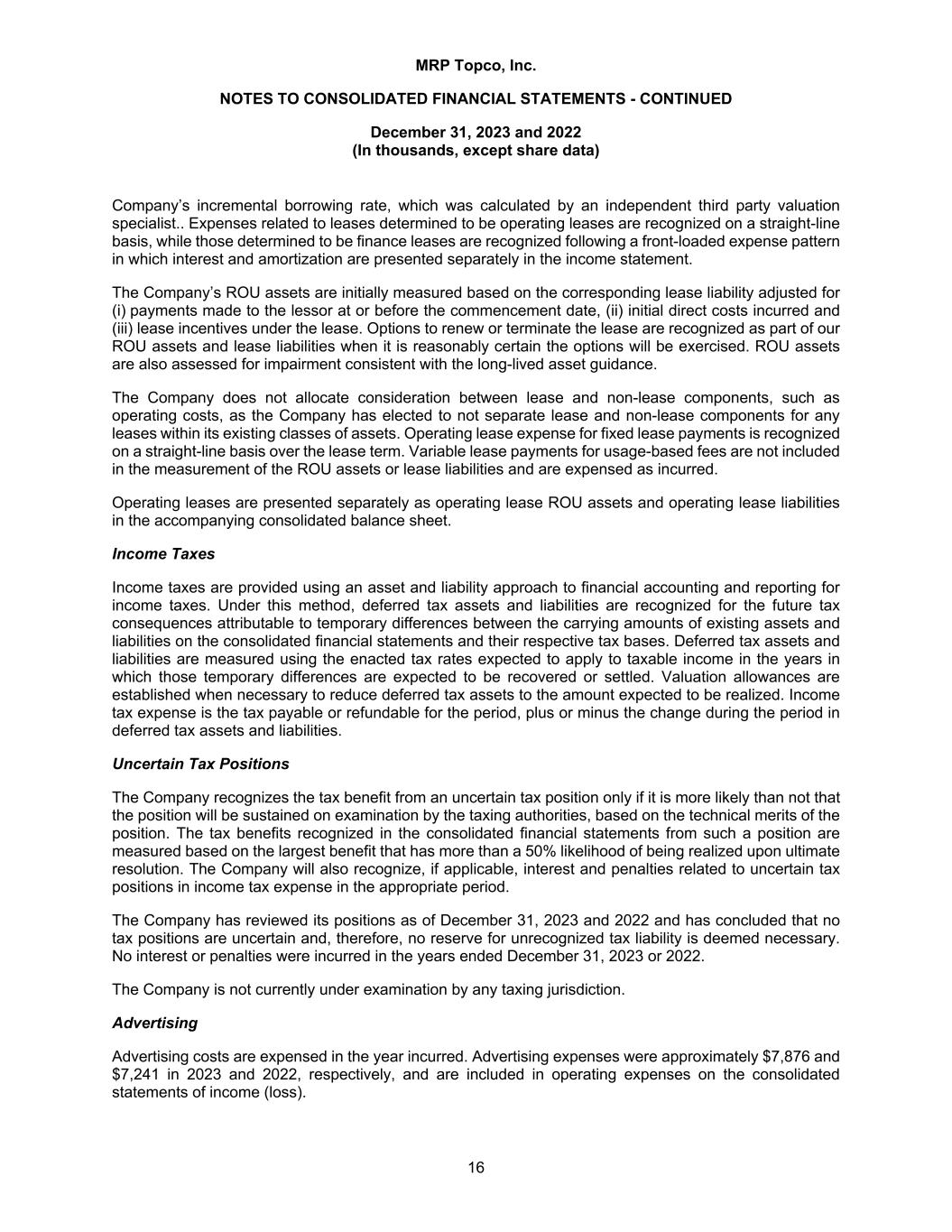 MRP Topco, Inc. NOTES TO CONSOLIDATED FINANCIAL STATEMENTS - CONTINUED December 31, 2023 and 2022 (In thousands, except share data) 16 Company’s incremental borrowing rate, which was calculated by an independent third party valuation specialist.. Expenses related to leases determined to be operating leases are recognized on a straight-line basis, while those determined to be finance leases are recognized following a front-loaded expense pattern in which interest and amortization are presented separately in the income statement. The Company’s ROU assets are initially measured based on the corresponding lease liability adjusted for (i) payments made to the lessor at or before the commencement date, (ii) initial direct costs incurred and (iii) lease incentives under the lease. Options to renew or terminate the lease are recognized as part of our ROU assets and lease liabilities when it is reasonably certain the options will be exercised. ROU assets are also assessed for impairment consistent with the long-lived asset guidance. The Company does not allocate consideration between lease and non-lease components, such as operating costs, as the Company has elected to not separate lease and non-lease components for any leases within its existing classes of assets. Operating lease expense for fixed lease payments is recognized on a straight-line basis over the lease term. Variable lease payments for usage-based fees are not included in the measurement of the ROU assets or lease liabilities and are expensed as incurred. Operating leases are presented separately as operating lease ROU assets and operating lease liabilities in the accompanying consolidated balance sheet. Income Taxes Income taxes are provided using an asset and liability approach to financial accounting and reporting for income taxes. Under this method, deferred tax assets and liabilities are recognized for the future tax consequences attributable to temporary differences between the carrying amounts of existing assets and liabilities on the consolidated financial statements and their respective tax bases. Deferred tax assets and liabilities are measured using the enacted tax rates expected to apply to taxable income in the years in which those temporary differences are expected to be recovered or settled. Valuation allowances are established when necessary to reduce deferred tax assets to the amount expected to be realized. Income tax expense is the tax payable or refundable for the period, plus or minus the change during the period in deferred tax assets and liabilities. Uncertain Tax Positions The Company recognizes the tax benefit from an uncertain tax position only if it is more likely than not that the position will be sustained on examination by the taxing authorities, based on the technical merits of the position. The tax benefits recognized in the consolidated financial statements from such a position are measured based on the largest benefit that has more than a 50% likelihood of being realized upon ultimate resolution. The Company will also recognize, if applicable, interest and penalties related to uncertain tax positions in income tax expense in the appropriate period. The Company has reviewed its positions as of December 31, 2023 and 2022 and has concluded that no tax positions are uncertain and, therefore, no reserve for unrecognized tax liability is deemed necessary. No interest or penalties were incurred in the years ended December 31, 2023 or 2022. The Company is not currently under examination by any taxing jurisdiction. Advertising Advertising costs are expensed in the year incurred. Advertising expenses were approximately $7,876 and $7,241 in 2023 and 2022, respectively, and are included in operating expenses on the consolidated statements of income (loss).
