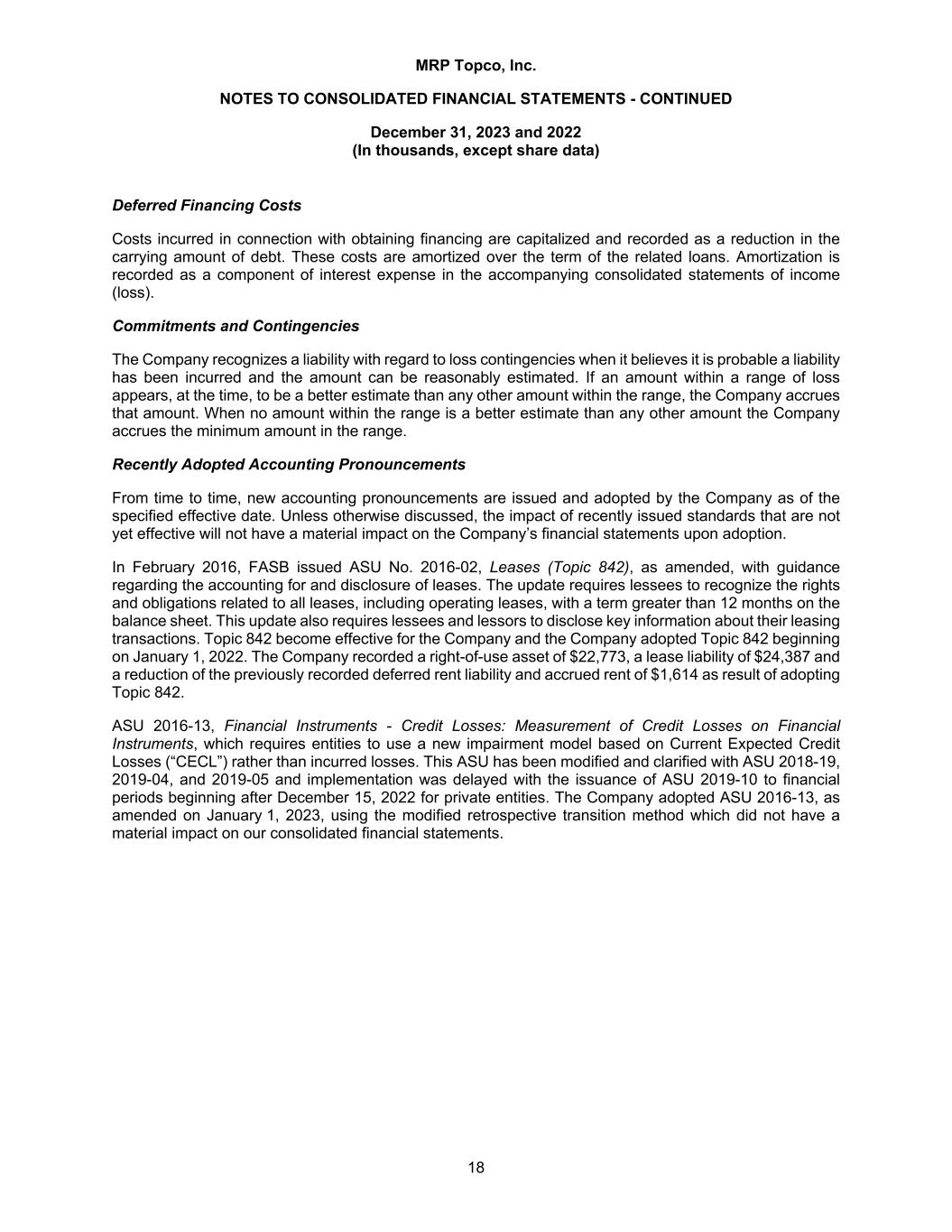 MRP Topco, Inc. NOTES TO CONSOLIDATED FINANCIAL STATEMENTS - CONTINUED December 31, 2023 and 2022 (In thousands, except share data) 18 Deferred Financing Costs Costs incurred in connection with obtaining financing are capitalized and recorded as a reduction in the carrying amount of debt. These costs are amortized over the term of the related loans. Amortization is recorded as a component of interest expense in the accompanying consolidated statements of income (loss). Commitments and Contingencies The Company recognizes a liability with regard to loss contingencies when it believes it is probable a liability has been incurred and the amount can be reasonably estimated. If an amount within a range of loss appears, at the time, to be a better estimate than any other amount within the range, the Company accrues that amount. When no amount within the range is a better estimate than any other amount the Company accrues the minimum amount in the range. Recently Adopted Accounting Pronouncements From time to time, new accounting pronouncements are issued and adopted by the Company as of the specified effective date. Unless otherwise discussed, the impact of recently issued standards that are not yet effective will not have a material impact on the Company’s financial statements upon adoption. In February 2016, FASB issued ASU No. 2016-02, Leases (Topic 842), as amended, with guidance regarding the accounting for and disclosure of leases. The update requires lessees to recognize the rights and obligations related to all leases, including operating leases, with a term greater than 12 months on the balance sheet. This update also requires lessees and lessors to disclose key information about their leasing transactions. Topic 842 become effective for the Company and the Company adopted Topic 842 beginning on January 1, 2022. The Company recorded a right-of-use asset of $22,773, a lease liability of $24,387 and a reduction of the previously recorded deferred rent liability and accrued rent of $1,614 as result of adopting Topic 842. ASU 2016-13, Financial Instruments - Credit Losses: Measurement of Credit Losses on Financial Instruments, which requires entities to use a new impairment model based on Current Expected Credit Losses (“CECL”) rather than incurred losses. This ASU has been modified and clarified with ASU 2018-19, 2019-04, and 2019-05 and implementation was delayed with the issuance of ASU 2019-10 to financial periods beginning after December 15, 2022 for private entities. The Company adopted ASU 2016-13, as amended on January 1, 2023, using the modified retrospective transition method which did not have a material impact on our consolidated financial statements.