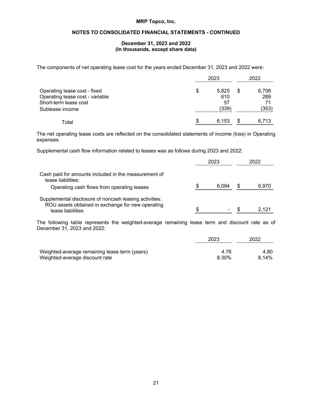 MRP Topco, Inc. NOTES TO CONSOLIDATED FINANCIAL STATEMENTS - CONTINUED December 31, 2023 and 2022 (In thousands, except share data) 21 The components of net operating lease cost for the years ended December 31, 2023 and 2022 were: 2023 2022 Operating lease cost - fixed $ 5,825 $ 6,706 Operating lease cost - variable 610 289 Short-term lease cost 57 71 Sublease income (339) (353) Total $ 6,153 $ 6,713 The net operating lease costs are reflected on the consolidated statements of income (loss) in Operating expenses. Supplemental cash flow information related to leases was as follows during 2023 and 2022: 2023 2022 Cash paid for amounts included in the measurement of lease liabilities: Operating cash flows from operating leases $ 6,094 $ 6,970 Supplemental disclosure of noncash leasing activities: ROU assets obtained in exchange for new operating lease liabilities $ - $ 2,121 The following table represents the weighted-average remaining lease term and discount rate as of December 31, 2023 and 2022: 2023 2022 Weighted-average remaining lease term (years) 4.76 4.80 Weighted-average discount rate 8.30% 8.14%