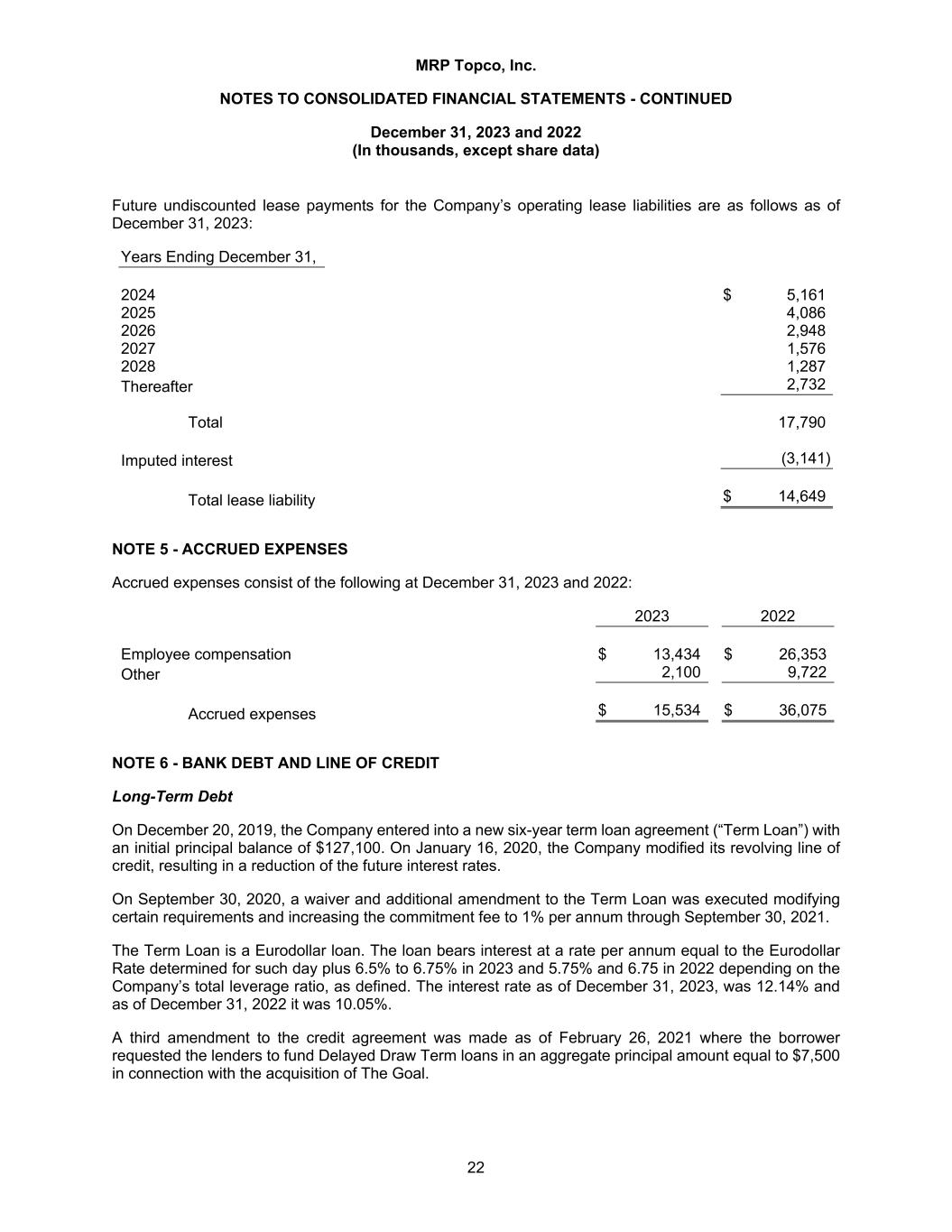 MRP Topco, Inc. NOTES TO CONSOLIDATED FINANCIAL STATEMENTS - CONTINUED December 31, 2023 and 2022 (In thousands, except share data) 22 Future undiscounted lease payments for the Company’s operating lease liabilities are as follows as of December 31, 2023: Years Ending December 31, 2024 $ 5,161 2025 4,086 2026 2,948 2027 1,576 2028 1,287 Thereafter 2,732 Total 17,790 Imputed interest (3,141) Total lease liability $ 14,649 NOTE 5 - ACCRUED EXPENSES Accrued expenses consist of the following at December 31, 2023 and 2022: 2023 2022 Employee compensation $ 13,434 $ 26,353 Other 2,100 9,722 Accrued expenses $ 15,534 $ 36,075 NOTE 6 - BANK DEBT AND LINE OF CREDIT Long-Term Debt On December 20, 2019, the Company entered into a new six-year term loan agreement (“Term Loan”) with an initial principal balance of $127,100. On January 16, 2020, the Company modified its revolving line of credit, resulting in a reduction of the future interest rates. On September 30, 2020, a waiver and additional amendment to the Term Loan was executed modifying certain requirements and increasing the commitment fee to 1% per annum through September 30, 2021. The Term Loan is a Eurodollar loan. The loan bears interest at a rate per annum equal to the Eurodollar Rate determined for such day plus 6.5% to 6.75% in 2023 and 5.75% and 6.75 in 2022 depending on the Company’s total leverage ratio, as defined. The interest rate as of December 31, 2023, was 12.14% and as of December 31, 2022 it was 10.05%. A third amendment to the credit agreement was made as of February 26, 2021 where the borrower requested the lenders to fund Delayed Draw Term loans in an aggregate principal amount equal to $7,500 in connection with the acquisition of The Goal.