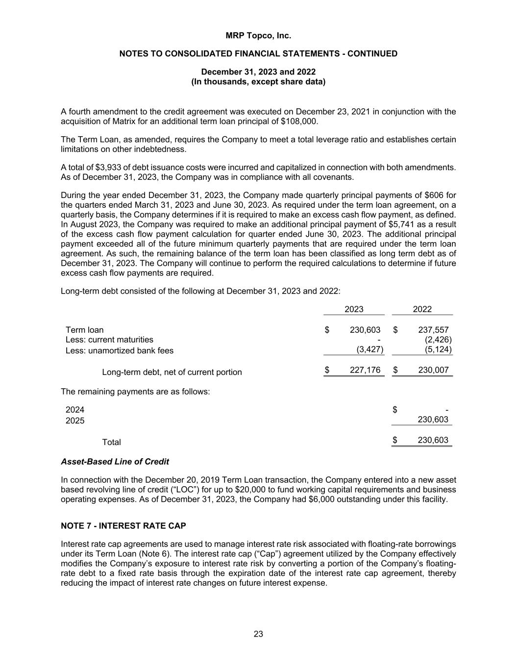 MRP Topco, Inc. NOTES TO CONSOLIDATED FINANCIAL STATEMENTS - CONTINUED December 31, 2023 and 2022 (In thousands, except share data) 23 A fourth amendment to the credit agreement was executed on December 23, 2021 in conjunction with the acquisition of Matrix for an additional term loan principal of $108,000. The Term Loan, as amended, requires the Company to meet a total leverage ratio and establishes certain limitations on other indebtedness. A total of $3,933 of debt issuance costs were incurred and capitalized in connection with both amendments. As of December 31, 2023, the Company was in compliance with all covenants. During the year ended December 31, 2023, the Company made quarterly principal payments of $606 for the quarters ended March 31, 2023 and June 30, 2023. As required under the term loan agreement, on a quarterly basis, the Company determines if it is required to make an excess cash flow payment, as defined. In August 2023, the Company was required to make an additional principal payment of $5,741 as a result of the excess cash flow payment calculation for quarter ended June 30, 2023. The additional principal payment exceeded all of the future minimum quarterly payments that are required under the term loan agreement. As such, the remaining balance of the term loan has been classified as long term debt as of December 31, 2023. The Company will continue to perform the required calculations to determine if future excess cash flow payments are required. Long-term debt consisted of the following at December 31, 2023 and 2022: 2023 2022 Term loan $ 230,603 $ 237,557 Less: current maturities - (2,426) Less: unamortized bank fees (3,427) (5,124) Long-term debt, net of current portion $ 227,176 $ 230,007 The remaining payments are as follows: 2024 $ - 2025 230,603 Total $ 230,603 Asset-Based Line of Credit In connection with the December 20, 2019 Term Loan transaction, the Company entered into a new asset based revolving line of credit (“LOC”) for up to $20,000 to fund working capital requirements and business operating expenses. As of December 31, 2023, the Company had $6,000 outstanding under this facility. NOTE 7 - INTEREST RATE CAP Interest rate cap agreements are used to manage interest rate risk associated with floating-rate borrowings under its Term Loan (Note 6). The interest rate cap (“Cap”) agreement utilized by the Company effectively modifies the Company’s exposure to interest rate risk by converting a portion of the Company’s floating- rate debt to a fixed rate basis through the expiration date of the interest rate cap agreement, thereby reducing the impact of interest rate changes on future interest expense.