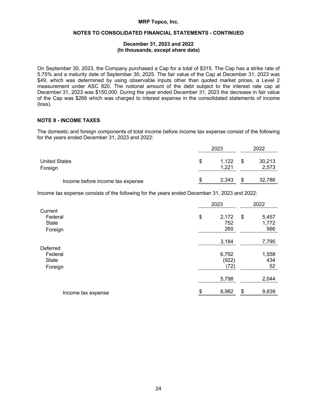 MRP Topco, Inc. NOTES TO CONSOLIDATED FINANCIAL STATEMENTS - CONTINUED December 31, 2023 and 2022 (In thousands, except share data) 24 On September 30, 2023, the Company purchased a Cap for a total of $315. The Cap has a strike rate of 5.75% and a maturity date of September 30, 2025. The fair value of the Cap at December 31, 2023 was $49, which was determined by using observable inputs other than quoted market prices, a Level 2 measurement under ASC 820. The notional amount of the debt subject to the interest rate cap at December 31, 2023 was $150,000. During the year ended December 31, 2023 the decrease in fair value of the Cap was $266 which was charged to interest expense in the consolidated statements of income (loss). NOTE 8 - INCOME TAXES The domestic and foreign components of total income before income tax expense consist of the following for the years ended December 31, 2023 and 2022: 2023 2022 United States $ 1,122 $ 30,213 Foreign 1,221 2,573 Income before income tax expense $ 2,343 $ 32,786 Income tax expense consists of the following for the years ended December 31, 2023 and 2022: 2023 2022 Current Federal $ 2,172 $ 5,457 State 752 1,772 Foreign 260 566 3,184 7,795 Deferred Federal 6,792 1,558 State (922) 434 Foreign (72) 52 5,798 2,044 Income tax expense $ 8,982 $ 9,839
