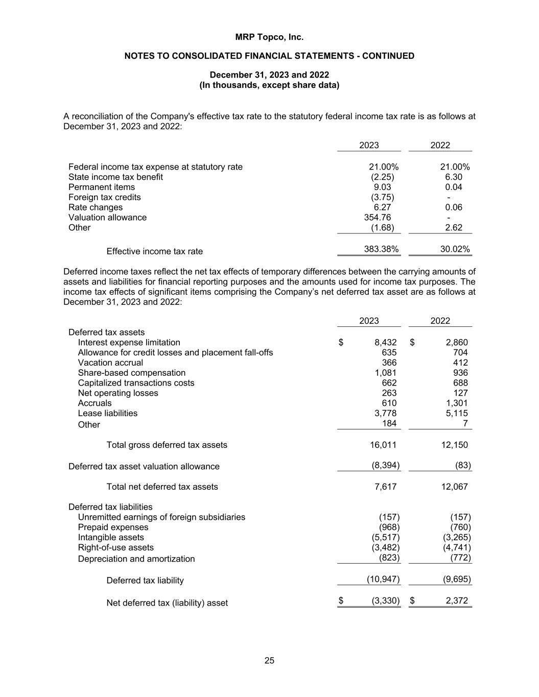 MRP Topco, Inc. NOTES TO CONSOLIDATED FINANCIAL STATEMENTS - CONTINUED December 31, 2023 and 2022 (In thousands, except share data) 25 A reconciliation of the Company's effective tax rate to the statutory federal income tax rate is as follows at December 31, 2023 and 2022: 2023 2022 Federal income tax expense at statutory rate 21.00% 21.00% State income tax benefit (2.25) 6.30 Permanent items 9.03 0.04 Foreign tax credits (3.75) - Rate changes 6.27 0.06 Valuation allowance 354.76 - Other (1.68) 2.62 Effective income tax rate 383.38% 30.02% Deferred income taxes reflect the net tax effects of temporary differences between the carrying amounts of assets and liabilities for financial reporting purposes and the amounts used for income tax purposes. The income tax effects of significant items comprising the Company’s net deferred tax asset are as follows at December 31, 2023 and 2022: 2023 2022 Deferred tax assets Interest expense limitation $ 8,432 $ 2,860 Allowance for credit losses and placement fall-offs 635 704 Vacation accrual 366 412 Share-based compensation 1,081 936 Capitalized transactions costs 662 688 Net operating losses 263 127 Accruals 610 1,301 Lease liabilities 3,778 5,115 Other 184 7 Total gross deferred tax assets 16,011 12,150 Deferred tax asset valuation allowance (8,394) (83) Total net deferred tax assets 7,617 12,067 Deferred tax liabilities Unremitted earnings of foreign subsidiaries (157) (157) Prepaid expenses (968) (760) Intangible assets (5,517) (3,265) Right-of-use assets (3,482) (4,741) Depreciation and amortization (823) (772) Deferred tax liability (10,947) (9,695) Net deferred tax (liability) asset $ (3,330) $ 2,372