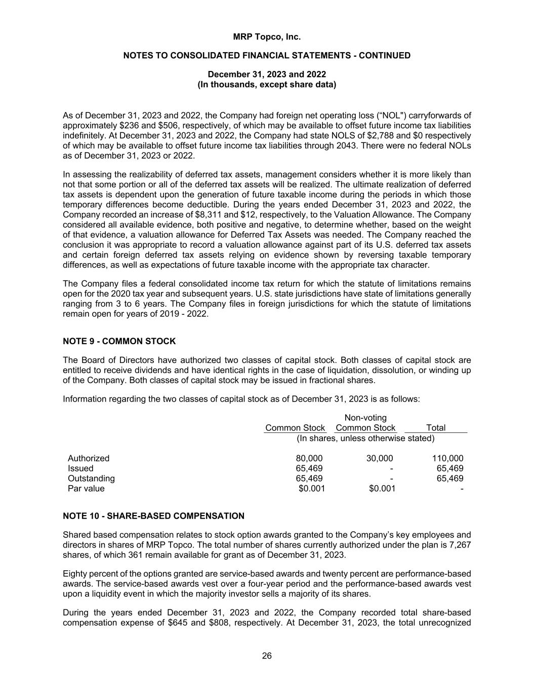 MRP Topco, Inc. NOTES TO CONSOLIDATED FINANCIAL STATEMENTS - CONTINUED December 31, 2023 and 2022 (In thousands, except share data) 26 As of December 31, 2023 and 2022, the Company had foreign net operating loss (“NOL") carryforwards of approximately $236 and $506, respectively, of which may be available to offset future income tax liabilities indefinitely. At December 31, 2023 and 2022, the Company had state NOLS of $2,788 and $0 respectively of which may be available to offset future income tax liabilities through 2043. There were no federal NOLs as of December 31, 2023 or 2022. In assessing the realizability of deferred tax assets, management considers whether it is more likely than not that some portion or all of the deferred tax assets will be realized. The ultimate realization of deferred tax assets is dependent upon the generation of future taxable income during the periods in which those temporary differences become deductible. During the years ended December 31, 2023 and 2022, the Company recorded an increase of $8,311 and $12, respectively, to the Valuation Allowance. The Company considered all available evidence, both positive and negative, to determine whether, based on the weight of that evidence, a valuation allowance for Deferred Tax Assets was needed. The Company reached the conclusion it was appropriate to record a valuation allowance against part of its U.S. deferred tax assets and certain foreign deferred tax assets relying on evidence shown by reversing taxable temporary differences, as well as expectations of future taxable income with the appropriate tax character. The Company files a federal consolidated income tax return for which the statute of limitations remains open for the 2020 tax year and subsequent years. U.S. state jurisdictions have state of limitations generally ranging from 3 to 6 years. The Company files in foreign jurisdictions for which the statute of limitations remain open for years of 2019 - 2022. NOTE 9 - COMMON STOCK The Board of Directors have authorized two classes of capital stock. Both classes of capital stock are entitled to receive dividends and have identical rights in the case of liquidation, dissolution, or winding up of the Company. Both classes of capital stock may be issued in fractional shares. Information regarding the two classes of capital stock as of December 31, 2023 is as follows: Common Stock Non-voting Common Stock Total (In shares, unless otherwise stated) Authorized 80,000 30,000 110,000 Issued 65,469 - 65,469 Outstanding 65,469 - 65,469 Par value $0.001 $0.001 - NOTE 10 - SHARE-BASED COMPENSATION Shared based compensation relates to stock option awards granted to the Company’s key employees and directors in shares of MRP Topco. The total number of shares currently authorized under the plan is 7,267 shares, of which 361 remain available for grant as of December 31, 2023. Eighty percent of the options granted are service-based awards and twenty percent are performance-based awards. The service-based awards vest over a four-year period and the performance-based awards vest upon a liquidity event in which the majority investor sells a majority of its shares. During the years ended December 31, 2023 and 2022, the Company recorded total share-based compensation expense of $645 and $808, respectively. At December 31, 2023, the total unrecognized