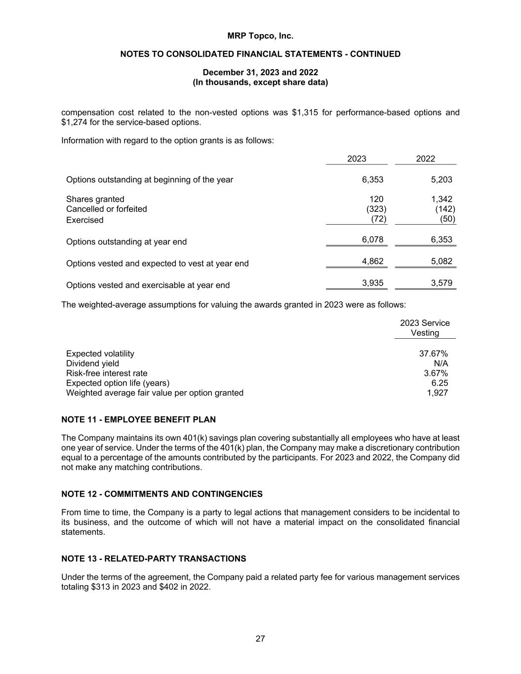 MRP Topco, Inc. NOTES TO CONSOLIDATED FINANCIAL STATEMENTS - CONTINUED December 31, 2023 and 2022 (In thousands, except share data) 27 compensation cost related to the non-vested options was $1,315 for performance-based options and $1,274 for the service-based options. Information with regard to the option grants is as follows: 2023 2022 Options outstanding at beginning of the year 6,353 5,203 Shares granted 120 1,342 Cancelled or forfeited (323) (142) Exercised (72) (50) Options outstanding at year end 6,078 6,353 Options vested and expected to vest at year end 4,862 5,082 Options vested and exercisable at year end 3,935 3,579 The weighted-average assumptions for valuing the awards granted in 2023 were as follows: 2023 Service Vesting Expected volatility 37.67% Dividend yield N/A Risk-free interest rate 3.67% Expected option life (years) 6.25 Weighted average fair value per option granted 1,927 NOTE 11 - EMPLOYEE BENEFIT PLAN The Company maintains its own 401(k) savings plan covering substantially all employees who have at least one year of service. Under the terms of the 401(k) plan, the Company may make a discretionary contribution equal to a percentage of the amounts contributed by the participants. For 2023 and 2022, the Company did not make any matching contributions. NOTE 12 - COMMITMENTS AND CONTINGENCIES From time to time, the Company is a party to legal actions that management considers to be incidental to its business, and the outcome of which will not have a material impact on the consolidated financial statements. NOTE 13 - RELATED-PARTY TRANSACTIONS Under the terms of the agreement, the Company paid a related party fee for various management services totaling $313 in 2023 and $402 in 2022.