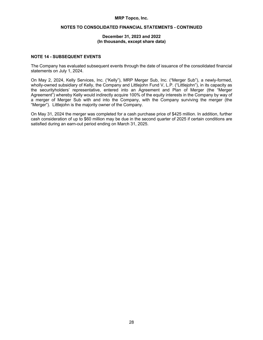 MRP Topco, Inc. NOTES TO CONSOLIDATED FINANCIAL STATEMENTS - CONTINUED December 31, 2023 and 2022 (In thousands, except share data) 28 NOTE 14 - SUBSEQUENT EVENTS The Company has evaluated subsequent events through the date of issuance of the consolidated financial statements on July 1, 2024. On May 2, 2024, Kelly Services, Inc. (“Kelly”), MRP Merger Sub, Inc. (“Merger Sub”), a newly-formed, wholly-owned subsidiary of Kelly, the Company and Littlejohn Fund V, L.P. (“Littlejohn”), in its capacity as the securityholders’ representative, entered into an Agreement and Plan of Merger (the “Merger Agreement”) whereby Kelly would indirectly acquire 100% of the equity interests in the Company by way of a merger of Merger Sub with and into the Company, with the Company surviving the merger (the “Merger”). Littlejohn is the majority owner of the Company. On May 31, 2024 the merger was completed for a cash purchase price of $425 million. In addition, further cash consideration of up to $60 million may be due in the second quarter of 2025 if certain conditions are satisfied during an earn-out period ending on March 31, 2025.