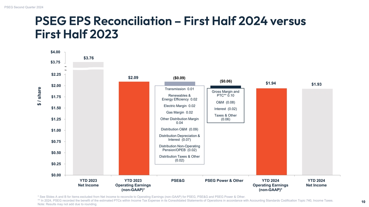 PSEG Second Quarter 2024 PSEG First Half Results PSEG EPS Summary – Six Months ended June 30, Net Income 2024 2023 Change PSE&G $1.58 $1.65 $(0.07) PSEG Power & Other $0.35 $2.11 $(1.76) Total PSEG $1.93 $3.76 $(1.83) Non-GAAP Operating Earnings* 2024 2023 Change PSE&G $1.58 $1.67 $(0.09) PSEG Power & Other $0.36 $0.42 $(0.06) Total PSEG $1.94 $2.09 $(0.15) 9 9 * See Slides A and B for Items excluded from Net Income to reconcile to Operating Earnings (non-GAAP) for PSEG, PSE&G and PSEG Power & Other.