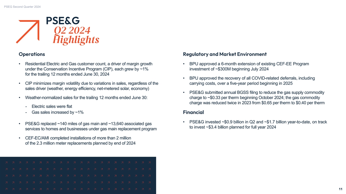 PSEG Second Quarter 2024 PSEG EPS Reconciliation – First Half 2024 versus First Half 2023 $4.00 $2.75 $3.76 $3.75 $2.50 ~ ~ $2.25 $2.09 ($0.09) ($0.06) $1.94 $1.93 $2.00 Transmission 0.01 Gross Margin and Renewables & PTC** 0.10 $1.75 Energy Efficiency 0.02 O&M (0.08) Electric Margin 0.02 $1.50 Interest (0.02) Gas Margin 0.02 Taxes & Other Other Distribution Margin $1.25 (0.06) 0.04 Distribution O&M (0.09) $1.00 Distribution Depreciation & Interest (0.07) $0.75 Distribution Non-Operating Pension/OPEB (0.02) $0.50 Distribution Taxes & Other (0.02) $0.25 $0.00 YTD 2023 YTD 2023 PSE&G PSEG Power & Other YTD 2024 YTD 2024 Net Income Operating Earnings Operating Earnings Net Income (non-GAAP)* (non-GAAP)* * See Slides A and B for Items excluded from Net Income to reconcile to Operating Earnings (non-GAAP) for PSEG, PSE&G and PSEG Power & Other. ** In 2024, PSEG recorded the benefit of the estimated PTCs within Income Tax Expense in its Consolidated Statements of Operations in accordance with Accounting Standards Codification Topic 740, Income Taxes. 10 10 Note: Results may not add due to rounding. $ / share
