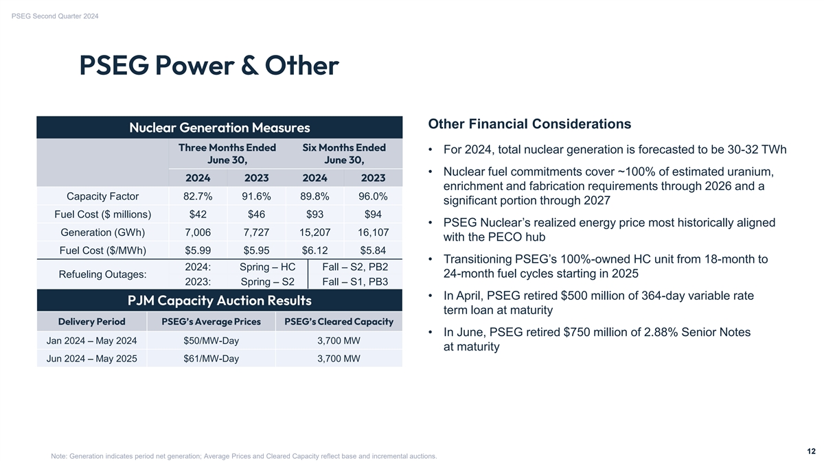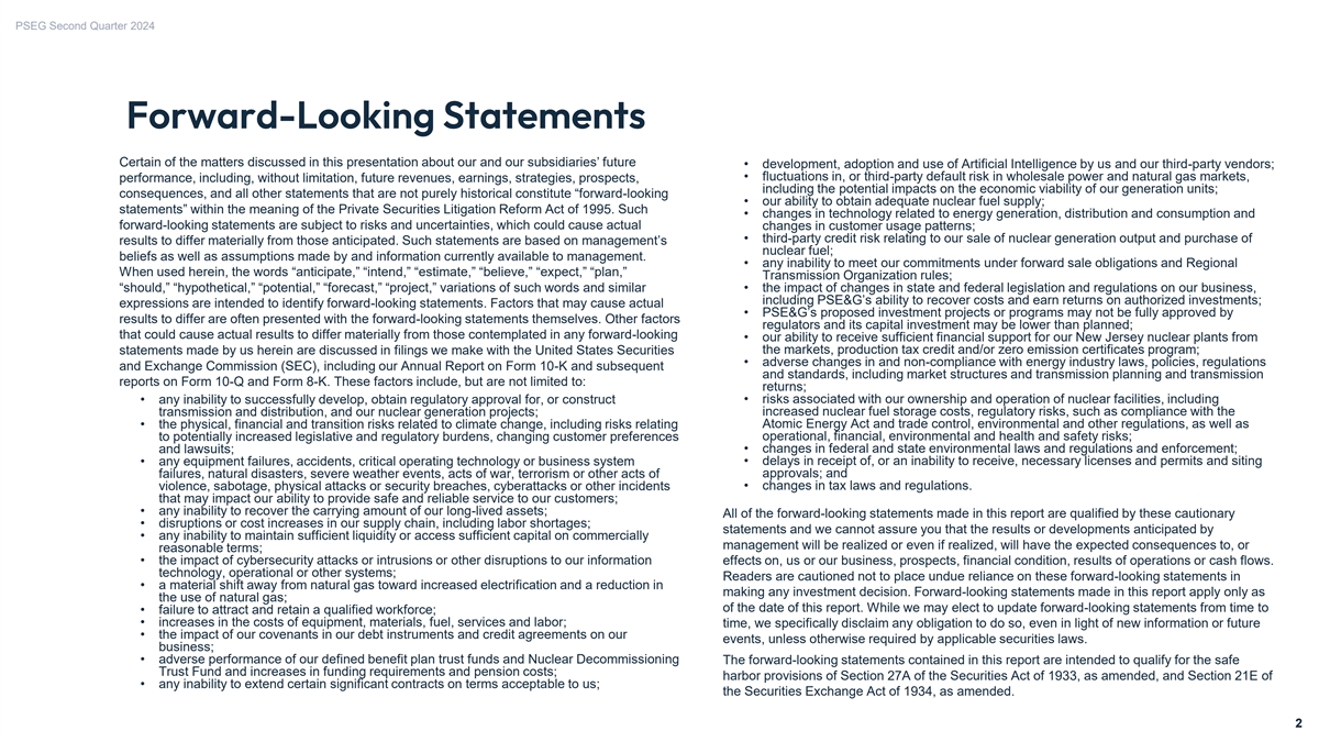 PSEG Second Quarter 2024 Forward-Looking Statements Certain of the matters discussed in this presentation about our and our subsidiaries’ future • development, adoption and use of Artificial Intelligence by us and our third-party vendors; • fluctuations in, or third-party default risk in wholesale power and natural gas markets, performance, including, without limitation, future revenues, earnings, strategies, prospects, including the potential impacts on the economic viability of our generation units; consequences, and all other statements that are not purely historical constitute “forward-looking • our ability to obtain adequate nuclear fuel supply; statements” within the meaning of the Private Securities Litigation Reform Act of 1995. Such • changes in technology related to energy generation, distribution and consumption and forward-looking statements are subject to risks and uncertainties, which could cause actual changes in customer usage patterns; • third-party credit risk relating to our sale of nuclear generation output and purchase of results to differ materially from those anticipated. Such statements are based on management’s nuclear fuel; beliefs as well as assumptions made by and information currently available to management. • any inability to meet our commitments under forward sale obligations and Regional When used herein, the words “anticipate,” “intend,” “estimate,” “believe,” “expect,” “plan,” Transmission Organization rules; “should,” “hypothetical,” “potential,” “forecast,” “project,” variations of such words and similar • the impact of changes in state and federal legislation and regulations on our business, including PSE&G’s ability to recover costs and earn returns on authorized investments; expressions are intended to identify forward-looking statements. Factors that may cause actual • PSE&G’s proposed investment projects or programs may not be fully approved by results to differ are often presented with the forward-looking statements themselves. Other factors regulators and its capital investment may be lower than planned; that could cause actual results to differ materially from those contemplated in any forward-looking • our ability to receive sufficient financial support for our New Jersey nuclear plants from statements made by us herein are discussed in filings we make with the United States Securities the markets, production tax credit and/or zero emission certificates program; • adverse changes in and non-compliance with energy industry laws, policies, regulations and Exchange Commission (SEC), including our Annual Report on Form 10-K and subsequent and standards, including market structures and transmission planning and transmission reports on Form 10-Q and Form 8-K. These factors include, but are not limited to: returns; • any inability to successfully develop, obtain regulatory approval for, or construct • risks associated with our ownership and operation of nuclear facilities, including transmission and distribution, and our nuclear generation projects; increased nuclear fuel storage costs, regulatory risks, such as compliance with the • the physical, financial and transition risks related to climate change, including risks relating Atomic Energy Act and trade control, environmental and other regulations, as well as to potentially increased legislative and regulatory burdens, changing customer preferences operational, financial, environmental and health and safety risks; and lawsuits; • changes in federal and state environmental laws and regulations and enforcement; • any equipment failures, accidents, critical operating technology or business system • delays in receipt of, or an inability to receive, necessary licenses and permits and siting failures, natural disasters, severe weather events, acts of war, terrorism or other acts of approvals; and violence, sabotage, physical attacks or security breaches, cyberattacks or other incidents • changes in tax laws and regulations. that may impact our ability to provide safe and reliable service to our customers; • any inability to recover the carrying amount of our long-lived assets; All of the forward-looking statements made in this report are qualified by these cautionary • disruptions or cost increases in our supply chain, including labor shortages; statements and we cannot assure you that the results or developments anticipated by • any inability to maintain sufficient liquidity or access sufficient capital on commercially management will be realized or even if realized, will have the expected consequences to, or reasonable terms; • the impact of cybersecurity attacks or intrusions or other disruptions to our information effects on, us or our business, prospects, financial condition, results of operations or cash flows. technology, operational or other systems; Readers are cautioned not to place undue reliance on these forward-looking statements in • a material shift away from natural gas toward increased electrification and a reduction in making any investment decision. Forward-looking statements made in this report apply only as the use of natural gas; of the date of this report. While we may elect to update forward-looking statements from time to • failure to attract and retain a qualified workforce; • increases in the costs of equipment, materials, fuel, services and labor; time, we specifically disclaim any obligation to do so, even in light of new information or future • the impact of our covenants in our debt instruments and credit agreements on our events, unless otherwise required by applicable securities laws. business; • adverse performance of our defined benefit plan trust funds and Nuclear Decommissioning The forward-looking statements contained in this report are intended to qualify for the safe Trust Fund and increases in funding requirements and pension costs; harbor provisions of Se
