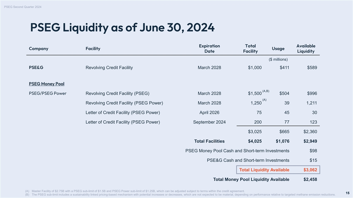 PSEG Second Quarter 2024 PSEG Maintains a Solid Financial Position PSEG Public Service Electric & Gas PSEG Senior Unsecured Credit Ratings PSE&G Senior Secured Credit Ratings Moody’s = Baa2 / Outlook = Stable S&P = BBB / Outlook = Stable Moody’s = A1 / Outlook = Stable S&P = A / Outlook = Stable PSEG Long-term Debt Outstanding $4.86B PSE&G Long-term Debt Outstanding $14.41B PSEG Consolidated Debt to Capitalization 57% PSEG Maturity Profile 2024 - 2028 PSEG Power Issuer Credit Ratings 2,500 Moody’s = Baa2 / Outlook = Stable S&P = BBB / Outlook = Stable 2,000 (1) PSEG Power Long-term Debt Outstanding $1.25B 1,500 1,000 PSEG Liquidity 500 • PSEG had approximately $3.1B of total available liquidity, including $113M 0 PSEG Liquidity and Net Cash Collateral Postings of cash and cash equivalents, at June 30, 2024 2024 2025 2026 2027 2028 • As of June 30, 2024, PSEG had minimal variable rate debt PSE&G PSEG Power PSEG All data is as of 6/30/2024 unless otherwise noted. (1) PSEG Power long-term debt is at a variable rate. As of 6/30/2024, PSEG had entered into floating-to-fixed interest rate swaps totaling $1.25B to reduce the volatility in interest expense for our variable rate debt on our $1.25B term loan due March 2025 at PSEG Power. Note: Total long-term debt outstanding amounts may not add to PSEG Consolidated total long-term debt outstanding due to rounding. Amounts on slide are rounded up to two decimal places. 14 14 Principal Maturing ($ Millions)