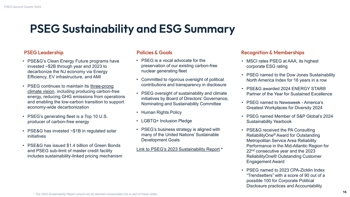 PSEG Second Quarter 2024 PSEG Liquidity as of June 30, 2024 Expiration Total Available Company Facility Usage Date Facility Liquidity ($ millions) PSE&G Revolving Credit Facility March 2028 $1,000 $411 $589 PSEG Money Pool (A,B) PSEG/PSEG Power Revolving Credit Facility (PSEG) March 2028 $1,500 $504 $996 (A) Revolving Credit Facility (PSEG Power) March 2028 1,250 39 1,211 Letter of Credit Facility (PSEG Power) April 2026 75 45 30 Letter of Credit Facility (PSEG Power) September 2024 200 77 123 $3,025 $665 $2,360 Total Facilities $4,025 $1,076 $2,949 PSEG Money Pool Cash and Short-term Investments $98 PSE&G Cash and Short-term Investments $15 Total Liquidity Available $3,062 Total Money Pool Liquidity Available $2,458 (A) Master Facility of $2.75B with a PSEG sub-limit of $1.5B and PSEG Power sub-limit of $1.25B, which can be adjusted subject to terms within the credit agreement. 15 15 (B) The PSEG sub-limit includes a sustainability linked pricing-based mechanism with potential increases or decreases, which are not expected to be material, depending on performance relative to targeted methane emission reductions.