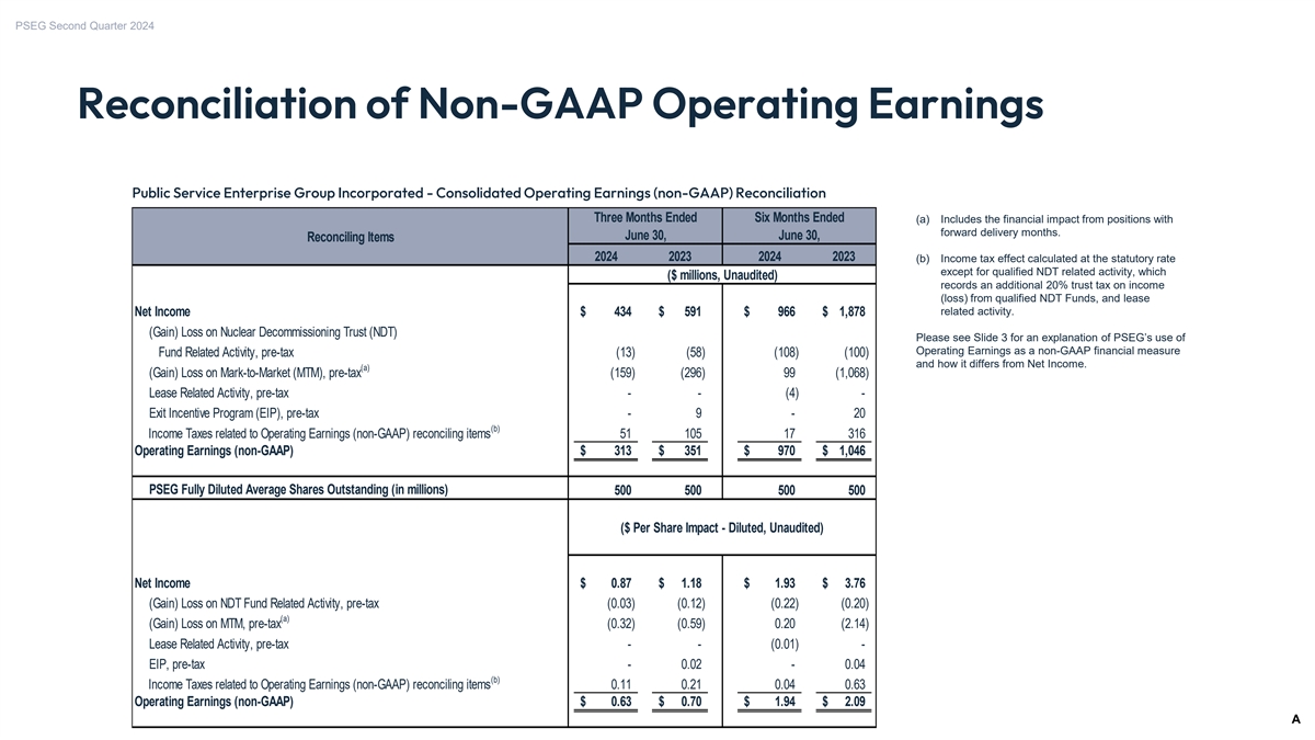 PSEG Second Quarter 2024 Reconciliation of Non-GAAP Operating Earnings Public Service Enterprise Group Incorporated - Consolidated Operating Earnings (non-GAAP) Reconciliation Three Months Ended Six Months Ended (a) Includes the financial impact from positions with forward delivery months. June 30, June 30, Reconciling Items 2024 2023 2024 2023 (b) Income tax effect calculated at the statutory rate except for qualified NDT related activity, which ($ millions, Unaudited) records an additional 20% trust tax on income (loss) from qualified NDT Funds, and lease related activity. Net Income $ 434 $ 591 $ 966 $ 1,878 (Gain) Loss on Nuclear Decommissioning Trust (NDT) Please see Slide 3 for an explanation of PSEG’s use of Operating Earnings as a non-GAAP financial measure Fund Related Activity, pre-tax (13) (58) (108) (100) and how it differs from Net Income. (a) (Gain) Loss on Mark-to-Market (MTM), pre-tax (159) (296) 99 (1,068) Lease Related Activity, pre-tax - - (4) - Exit Incentive Program (EIP), pre-tax - 9 - 20 (b) Income Taxes related to Operating Earnings (non-GAAP) reconciling items 51 105 17 316 Operating Earnings (non-GAAP) $ 313 $ 351 $ 970 $ 1,046 PSEG Fully Diluted Average Shares Outstanding (in millions) 500 500 500 500 ($ Per Share Impact - Diluted, Unaudited) Net Income $ 0.87 $ 1.18 $ 1 .93 $ 3.76 (Gain) Loss on NDT Fund Related Activity, pre-tax (0.03) ( 0.12) (0.22) ( 0.20) (a) (Gain) Loss on MTM, pre-tax (0.32) ( 0.59) 0.20 (2.14) Lease Related Activity, pre-tax - - (0.01) - EIP, pre-tax - 0.02 - 0.04 (b) Income Taxes related to Operating Earnings (non-GAAP) reconciling items 0.11 0.21 0.04 0.63 Operating Earnings (non-GAAP) $ 0.63 $ 0.70 $ 1.94 $ 2.09 A 18 18