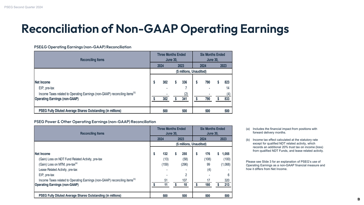 PSEG Second Quarter 2024 Reconciliation of Non-GAAP Operating Earnings PSE&G Operating Earnings (non-GAAP) Reconciliation Three Months Ended Six Months Ended Reconciling Items June 30, June 30, 2024 2023 2024 2023 ($ millions, Unaudited) Net Income $ 302 $ 336 $ 790 $ 823 EIP, pre-tax - 7 - 14 (b) Income Taxes related to Operating Earnings (non-GAAP) reconciling items - (2) - (4) Operating Earnings (non-GAAP) $ 302 $ 341 $ 790 $ 833 PSEG Fully Diluted Average Shares Outstanding (in millions) 500 500 500 500 PSEG Power & Other Operating Earnings (non-GAAP) Reconciliation (a) Includes the financial impact from positions with Three Months Ended Six Months Ended forward delivery months. Reconciling Items June 30, June 30, 2024 2023 2024 2023 (b) Income tax effect calculated at the statutory rate except for qualified NDT related activity, which ($ millions, Unaudited) records an additional 20% trust tax on income (loss) from qualified NDT Funds, and lease related activity. Net Income $ 132 $ 255 $ 176 $ 1,055 (Gain) Loss on NDT Fund Related Activity, pre-tax (13) (58) (108) ( 100) Please see Slide 3 for an explanation of PSEG’s use of (a) (Gain) Loss on MTM, pre-tax (159) ( 296) 99 (1,068) Operating Earnings as a non-GAAP financial measure and how it differs from Net Income. Lease Related Activity, pre-tax - - (4) - EIP, pre-tax - 2 - 6 (b) Income Taxes related to Operating Earnings (non-GAAP) reconciling items 51 107 17 320 Operating Earnings (non-GAAP) $ 11 $ 10 $ 180 $ 213 PSEG Fully Diluted Average Shares Outstanding (in millions) 500 500 500 500 B 19 19