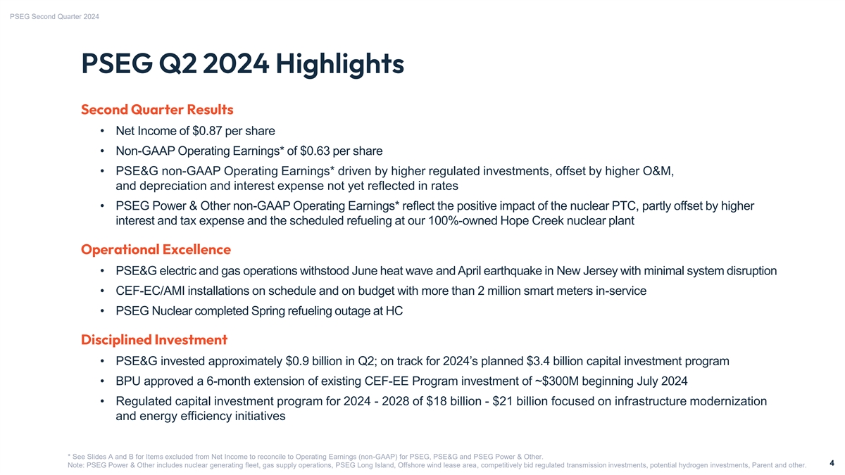 PSEG Second Quarter 2024 GAAP Disclaimer PSEG presents Operating Earnings in addition to its Net Income Net Income, which is an indicator of financial performance reported in accordance with accounting principles generally determined in accordance with GAAP. In addition, non-GAAP accepted in the United States (GAAP). Operating Earnings is a Operating Earnings as presented in this release may not be non-GAAP financial measure that differs from Net Income. Non- comparable to similarly titled measures used by other GAAP Operating Earnings exclude the impact of gains (losses) companies. associated with the Nuclear Decommissioning Trust (NDT), Due to the forward-looking nature of non-GAAP Operating Mark-to-Market (MTM) accounting and other material infrequent Earnings guidance, PSEG is unable to reconcile this non-GAAP items. The last two slides in this presentation (Slides A and B) financial measure to the most directly comparable GAAP include a list of items excluded from Net Income to reconcile to financial measure because comparable GAAP measures are not non-GAAP Operating Earnings with a reference to those slides reasonably accessible or reliable due to the inherent difficulty in included on each of the slides where the non-GAAP information forecasting and quantifying measures that would be required for appears. such reconciliation. Namely, we are not able to reliably project Management uses non-GAAP Operating Earnings in its internal without unreasonable effort MTM and NDT gains (losses), for analysis, and in communications with investors and analysts, as future periods due to market volatility. These items are a consistent measure for comparing PSEG’s financial uncertain, depend on various factors, and may have a material performance to previous financial results. The presentation of impact on our future GAAP results. non-GAAP Operating Earnings is intended to complement, and should not be considered an alternative to, the presentation of From time to time, PSEG and PSE&G release important information via postings on their corporate Investor Relations website at https://investor.pseg.com. Investors and other interested parties are encouraged to visit the Investor Relations website to review new postings. You can sign up for automatic email alerts regarding new postings at the bottom of the webpage at https://investor.pseg.com or by navigating to the Email Alerts webpage here. The information on https://investor.pseg.com and https://investor.pseg.com/resources/email-alerts/default.aspx is not incorporated herein and is not part of this communication or the Form 8-K to which it is an exhibit. 3 3
