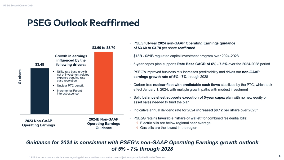 PSEG Second Quarter 2024 PSEG Q2 2024 Highlights Second Quarter Results • Net Income of $0.87 per share • Non-GAAP Operating Earnings* of $0.63 per share • PSE&G non-GAAP Operating Earnings* driven by higher regulated investments, offset by higher O&M, and depreciation and interest expense not yet reflected in rates • PSEG Power & Other non-GAAP Operating Earnings* reflect the positive impact of the nuclear PTC, partly offset by higher interest and tax expense and the scheduled refueling at our 100%-owned Hope Creek nuclear plant Operational Excellence • PSE&G electric and gas operations withstood June heat wave and April earthquake in New Jersey with minimal system disruption • CEF-EC/AMI installations on schedule and on budget with more than 2 million smart meters in-service • PSEG Nuclear completed Spring refueling outage at HC Disciplined Investment • PSE&G invested approximately $0.9 billion in Q2; on track for 2024’s planned $3.4 billion capital investment program • BPU approved a 6-month extension of existing CEF-EE Program investment of ~$300M beginning July 2024 • Regulated capital investment program for 2024 - 2028 of $18 billion - $21 billion focused on infrastructure modernization and energy efficiency initiatives * See Slides A and B for Items excluded from Net Income to reconcile to Operating Earnings (non-GAAP) for PSEG, PSE&G and PSEG Power & Other. 4 4 Note: PSEG Power & Other includes nuclear generating fleet, gas supply operations, PSEG Long Island, Offshore wind lease area, competitively bid regulated transmission investments, potential hydrogen investments, Parent and other.
