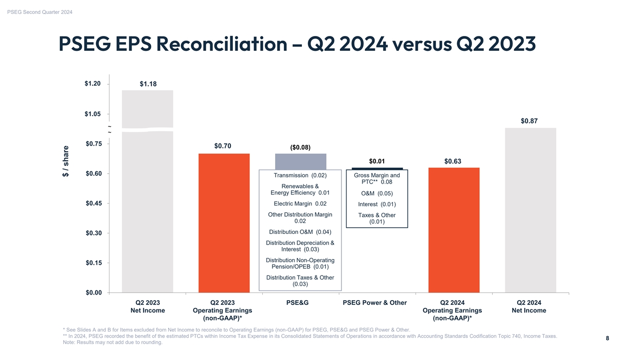 PSEG Second Quarter 2024 PSEG Q2 Results PSEG EPS Summary – Three Months ended June 30, Net Income 2024 2023 Change PSE&G $0.60 $0.67 $(0.07) PSEG Power & Other $0.27 $0.51 $(0.24) Total PSEG $0.87 $1.18 $(0.31) Non-GAAP Operating Earnings* 2024 2023 Change PSE&G $0.60 $0.68 $(0.08) PSEG Power & Other $0.03 $0.02 $0.01 Total PSEG $0.63 $0.70 $(0.07) 7 7 * See Slides A and B for Items excluded from Net Income to reconcile to Operating Earnings (non-GAAP) for PSEG, PSE&G and PSEG Power & Other.
