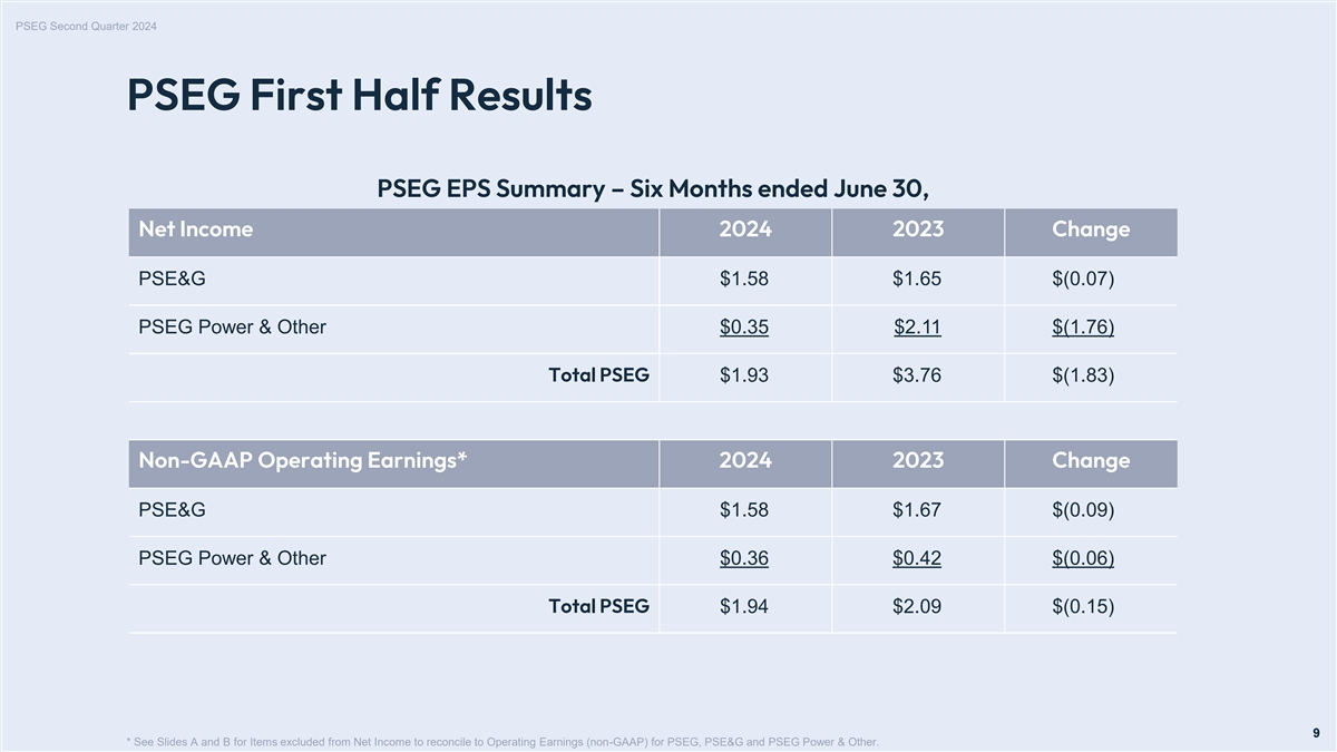 PSEG Second Quarter 2024 PSEG EPS Reconciliation – Q2 2024 versus Q2 2023 $1.20 $1.18 $1.05 $1.05 $0.90 $0.87 ~ ~ $0.75 $0.70 ($0.08) $0.01 $0.63 $0.60 Transmission (0.02) Gross Margin and PTC** 0.08 Renewables & Energy Efficiency 0.01 O&M (0.05) $0.45 Electric Margin 0.02 Interest (0.01) Other Distribution Margin Taxes & Other 0.02 (0.01) Distribution O&M (0.04) $0.30 Distribution Depreciation & Interest (0.03) Distribution Non-Operating $0.15 Pension/OPEB (0.01) Distribution Taxes & Other (0.03) $0.00 Q2 2023 Q2 2023 PSE&G PSEG Power & Other Q2 2024 Q2 2024 Net Income Operating Earnings Operating Earnings Net Income (non-GAAP)* (non-GAAP)* * See Slides A and B for Items excluded from Net Income to reconcile to Operating Earnings (non-GAAP) for PSEG, PSE&G and PSEG Power & Other. ** In 2024, PSEG recorded the benefit of the estimated PTCs within Income Tax Expense in its Consolidated Statements of Operations in accordance with Accounting Standards Codification Topic 740, Income Taxes. 8 8 Note: Results may not add due to rounding. $ / share
