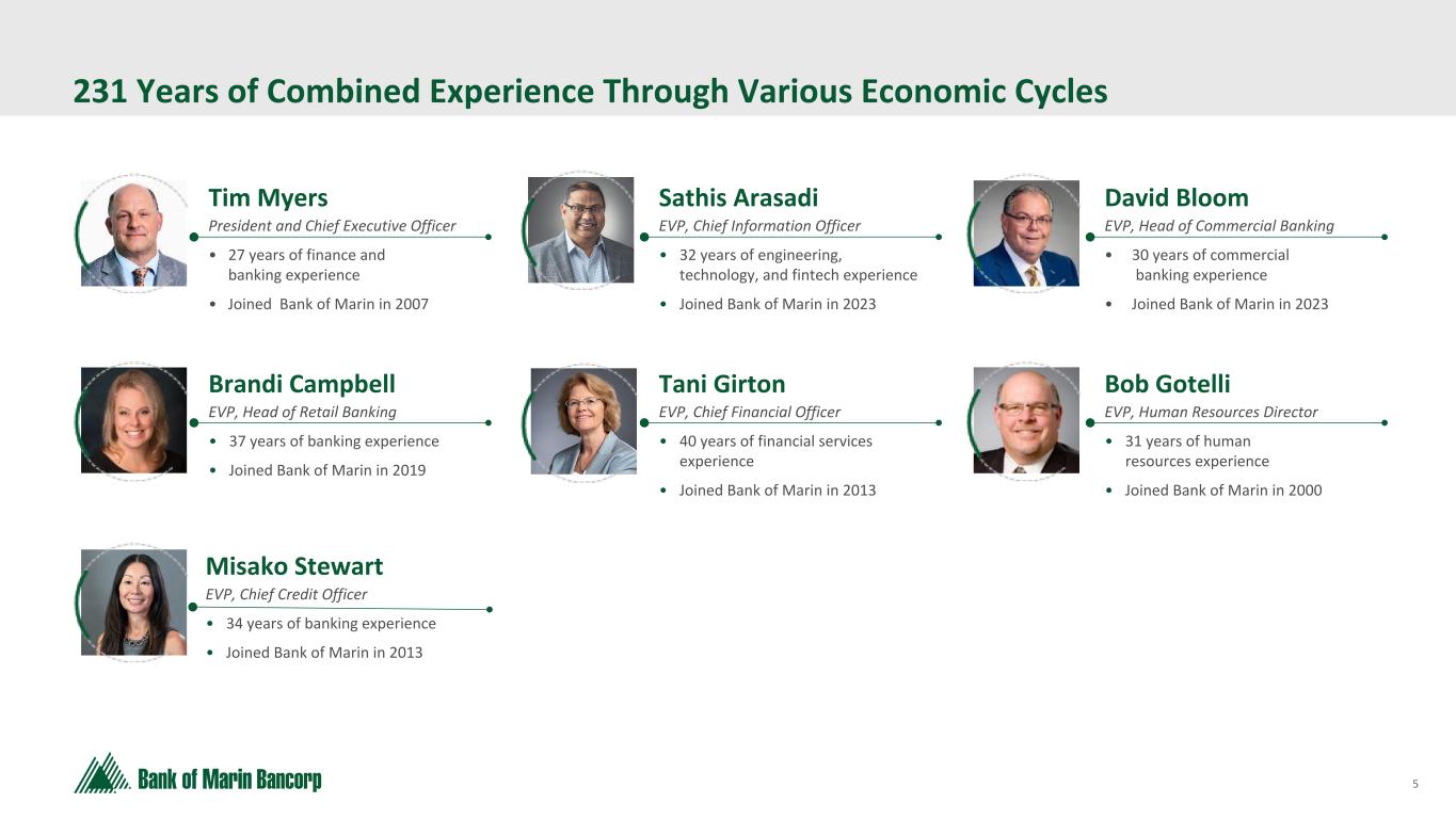 4 Text 95,96,96 Light Gray 232, 232, 232 Black 0, 0, 0 White 255, 255, 255 Accent 1 7,89,52 Accent 2 248,153,40 Accent 3 254,217,129 Accent 4 52,153,70 Accent 5 5,39,67 Accent 6 171,184,195 Bank of Marin Bancorp Novato, CA Headquarters BMRC NASDAQ $263.5 Million Market Cap $3.7 Billion Total Assets 6.18% Dividend Yield 16.46% Total RBC BMRC AT A GLANCE Data as of June 30 2024 Relationship Banking Build strong, long-term customer relationships based on trust, integrity and expertise, inspiring loyalty though exceptional service. Disciplined Fundamentals Apply a disciplined business approach with sound banking practices, high quality products, and consistent fundamentals ensuring continued strong results. Community Commitment Give back to the communities that we serve through active employee volunteerism, nonprofit board leadership and financial contributions. 27 Branch Locations 8 Commercial Banking Offices