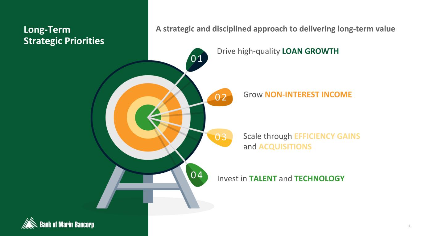 5 Text 95,96,96 Light Gray 232, 232, 232 Black 0, 0, 0 White 255, 255, 255 Accent 1 7,89,52 Accent 2 248,153,40 Accent 3 254,217,129 Accent 4 52,153,70 Accent 5 5,39,67 Accent 6 171,184,195 Bob Gotelli EVP, Human Resources Director • 31 years of human resources experience • Joined Bank of Marin in 2000 David Bloom EVP, Head of Commercial Banking • 30 years of commercial banking experience • Joined Bank of Marin in 2023 Tim Myers President and Chief Executive Officer • 27 years of finance and banking experience • Joined Bank of Marin in 2007 Brandi Campbell EVP, Head of Retail Banking • 37 years of banking experience • Joined Bank of Marin in 2019 Sathis Arasadi EVP, Chief Information Officer • 32 years of engineering, technology, and fintech experience • Joined Bank of Marin in 2023 Tani Girton EVP, Chief Financial Officer • 40 years of financial services experience • Joined Bank of Marin in 2013 Misako Stewart EVP, Chief Credit Officer • 34 years of banking experience • Joined Bank of Marin in 2013 231 Years of Combined Experience Through Various Economic Cycles