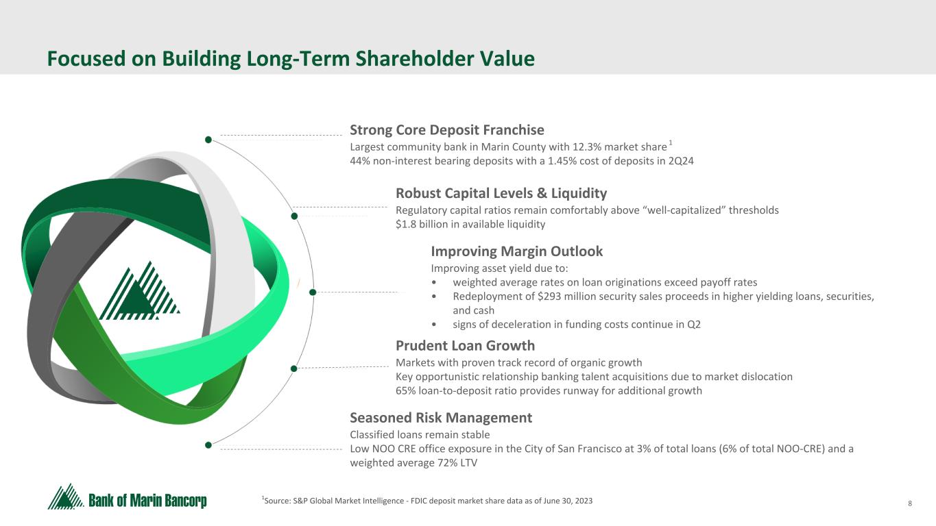 7 Text 95,96,96 Light Gray 232, 232, 232 Black 0, 0, 0 White 255, 255, 255 Accent 1 7,89,52 Accent 2 248,153,40 Accent 3 254,217,129 Accent 4 52,153,70 Accent 5 5,39,67 Accent 6 171,184,195 Second Quarter 2024 Highlights (1) See Reconciliation of Non-GAAP Financial Measures in the Appendix Loan Growth & Balance Sheet Repositioning • Total portfolio loan balances increased 1.3% • New commitments of $94 million, $64 million of which funded • Sold $325 million (56% of AFS portfolio) securities yielding 1.94% • Redeployment of the $293 million proceeds is expected to contribute to a 30 bps lift in annualized NIM beginning in Q3, assuming an average reinvestment yield of 5.75% • Reduced borrowings by $58.5 million costing 5.50% • Purchased $19.0 million in higher yielding AFS securities with average yield of 5.23% • Remaining cash at Federal Reserve with average yield of 5.40% Capital • Bancorp total risk-based capital remained strong at 16.5% • Bancorp TCE / TA of 9.9%, 7.7% when adjusted for HTM securities 1 Key Operating Trends • Tax-equivalent yield on interest-earning assets of 3.84%, up 9 bps • Tax-equivalent net interest margin increased to 2.52% from 2.50% • Cost of deposits up slightly 7 bps Deposits and Liquidity • Non-interest bearing deposits stay strong at 44% of total deposits • Total cost of deposits was 1.45% (interest-bearing 2.56%) for Q2 and 1.46% (interest-bearing 2.60%) for the month of June • Total deposits decreased 2.1% • Uninsured deposits estimated to represent 28% of total deposits • Net available funding $1.8 billion • Strong liquidity provides 202% coverage of estimated uninsured deposits Credit Quality • Non-accrual loans of 1.62% (from 0.31% last quarter) of total loans, due largely to 2 relationships totaling $27.2 million moved to non-accrual status in Q2 • Classified loans stable and down to 2.63% (from 2.67% last quarter) of total loans • $5.2 million provision for credit losses, primarily due to an increased individual reserve on one loan placed on non-accrual