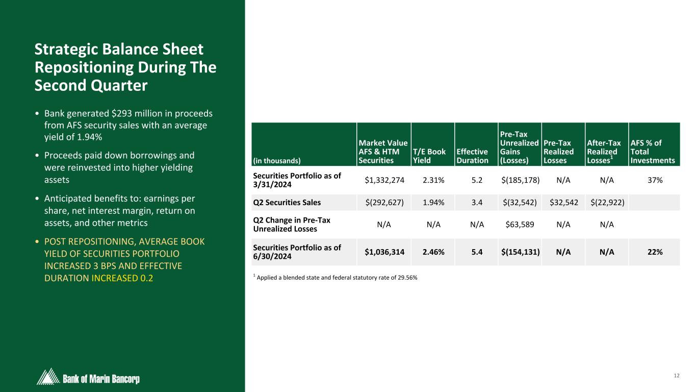 35 Text 95,96,96 Light Gray 232, 232, 232 Black 0, 0, 0 White 255, 255, 255 Accent 1 7,89,52 Accent 2 248,153,40 Accent 3 254,217,129 Accent 4 52,153,70 Accent 5 5,39,67 Accent 6 171,184,195 Reconciliation of GAAP to Non-GAAP Financial Measures (Excluding Loss on Sale of Securities) (in thousand, unaudited) Three months ended Six months ended Net (loss) income June 30, 2024 March 31, 2024 June 30, 2024 June 30, 2023 Net (loss) income (GAAP) $ (21,902) $ 2,922 $ (18,980) $ 13,991 Adjustments: Losses on sale of investment securities 32,542 — 32,542 — Income tax benefit (9,620) — (9,620) — Adjustments, net of taxes 22,922 — 22,922 — Comparable net income (non-GAAP) 1,020 2,922 3,942 13,991 Diluted (loss) earnings per share Weighted average diluted shares 16,114 16,092 16,103 16,008 Diluted (loss) earnings per share (GAAP) $ (1.36) $ 0.18 $ (1.18) $ 0.87 Comparable diluted earnings per share (non-GAAP) $ 0.06 $ 0.18 $ 0.24 $ 0.87 Return on average assets Average assets $ 3,751,159 $ 3,811,270 $ 3,781,214 $ 4,141,284 Return on average assets (GAAP) (2.35) % 0.31 % (1.01) % 0.68 % Comparable return on average assets (non-GAAP) 0.11 % 0.31 % 0.21 % 0.68 % Return on average equity Average stockholders' equity $ 432,692 $ 435,973 $ 434,332 $ 424,386 Return on average equity (GAAP) (20.36) % 2.70 % (8.79) % 6.65 % Comparable return on average equity (non-GAAP) 0.95 % 2.70 % 1.83 % 6.65 % Efficiency ratio Non-interest expense $ 21,894 $ 21,169 $ 43,063 $ 40,445 Net interest income $ 22,467 $ 22,694 $ 45,161 $ 54,029 Non-interest income (GAAP) $ (29,755) $ 2,754 $ (27,001) $ 5,674 Losses on sale of investment securities 32,542 — 32,542 — Non-interest income (non-GAAP) $ 2,787 $ 2,754 $ 5,541 $ 5,674 Efficiency ratio (GAAP) (300.37) % 83.18 % 237.13 % 67.74 % Comparable efficiency ratio (non-GAAP) 86.70 % 83.18 % 84.93 % 67.74 %