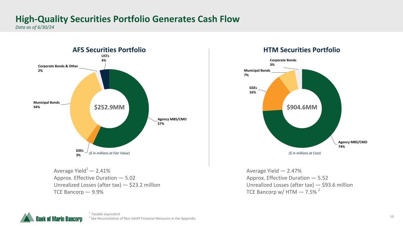 12 Text 95,96,96 Light Gray 232, 232, 232 Black 0, 0, 0 White 255, 255, 255 Accent 1 7,89,52 Accent 2 248,153,40 Accent 3 254,217,129 Accent 4 52,153,70 Accent 5 5,39,67 Accent 6 171,184,195 Strategic Balance Sheet Repositioning During The Second Quarter • Bank generated $293 million in proceeds from AFS security sales with an average yield of 1.94% • Proceeds paid down borrowings and were reinvested into higher yielding assets • Anticipated benefits to: earnings per share, net interest margin, return on assets, and other metrics • POST REPOSITIONING, AVERAGE BOOK YIELD OF SECURITIES PORTFOLIO INCREASED 3 BPS AND EFFECTIVE DURATION INCREASED 0.2 (in thousands) Market Value AFS & HTM Securities T/E Book Yield Effective Duration Pre-Tax Unrealized Gains (Losses) Pre-Tax Realized Losses After-Tax Realized Losses1 AFS % of Total Investments Securities Portfolio as of 3/31/2024 $1,332,274 2.31% 5.2 $(185,178) N/A N/A 37% Q2 Securities Sales $(292,627) 1.94% 3.4 $(32,542) $32,542 $(22,922) Q2 Change in Pre-Tax Unrealized Losses N/A N/A N/A $63,589 N/A N/A Securities Portfolio as of 6/30/2024 $1,036,314 2.46% 5.4 $(154,131) N/A N/A 22% 1 Applied a blended state and federal statutory rate of 29.56%