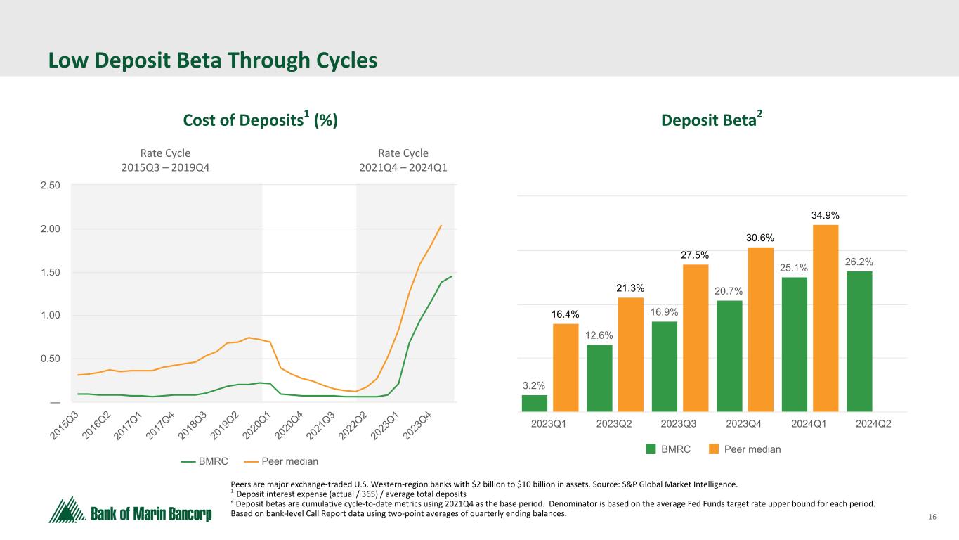 15 Text 95,96,96 Light Gray 232, 232, 232 Black 0, 0, 0 White 255, 255, 255 Accent 1 7,89,52 Accent 2 248,153,40 Accent 3 254,217,129 Accent 4 52,153,70 Accent 5 5,39,67 Accent 6 171,184,195 New Accounts Mix (by count) 2Q24Granular Deposit Account Composition Existing Relationships - New $ 17% Account Migration 27% New Relationships 56% 1,336 (in thousands; except for # of Accounts) Interest Bearing Non-Interest Bearing Total Consumer Account Balances $ 987,528 $ 325,735 $ 1,313,263 # of Accounts 15,793 17,542 33,335 Avg Balance Per Account $ 63 $ 19 $ 39 Business Account Balances $ 807,216 $ 1,085,265 $ 1,892,481 # of Accounts 3,989 11,436 15,425 Avg Balance Per Account $ 202 $ 95 $ 123 *Excludes internal operating accounts such as holding company cash and deposit settlement accounts totaling $8.0 million Deposit Accounts Mix - Consumer vs Business 2Q24 • 56% of new accounts consisted of new relationships to the Bank • 42% of new accounts were interest- bearing by count • 74% of new accounts were interest- bearing in dollars at a weighted average rate of 3.18% • Reciprocal deposit network program (expanded FDIC insurance products) utilization decreased notionally by $18.3 million
