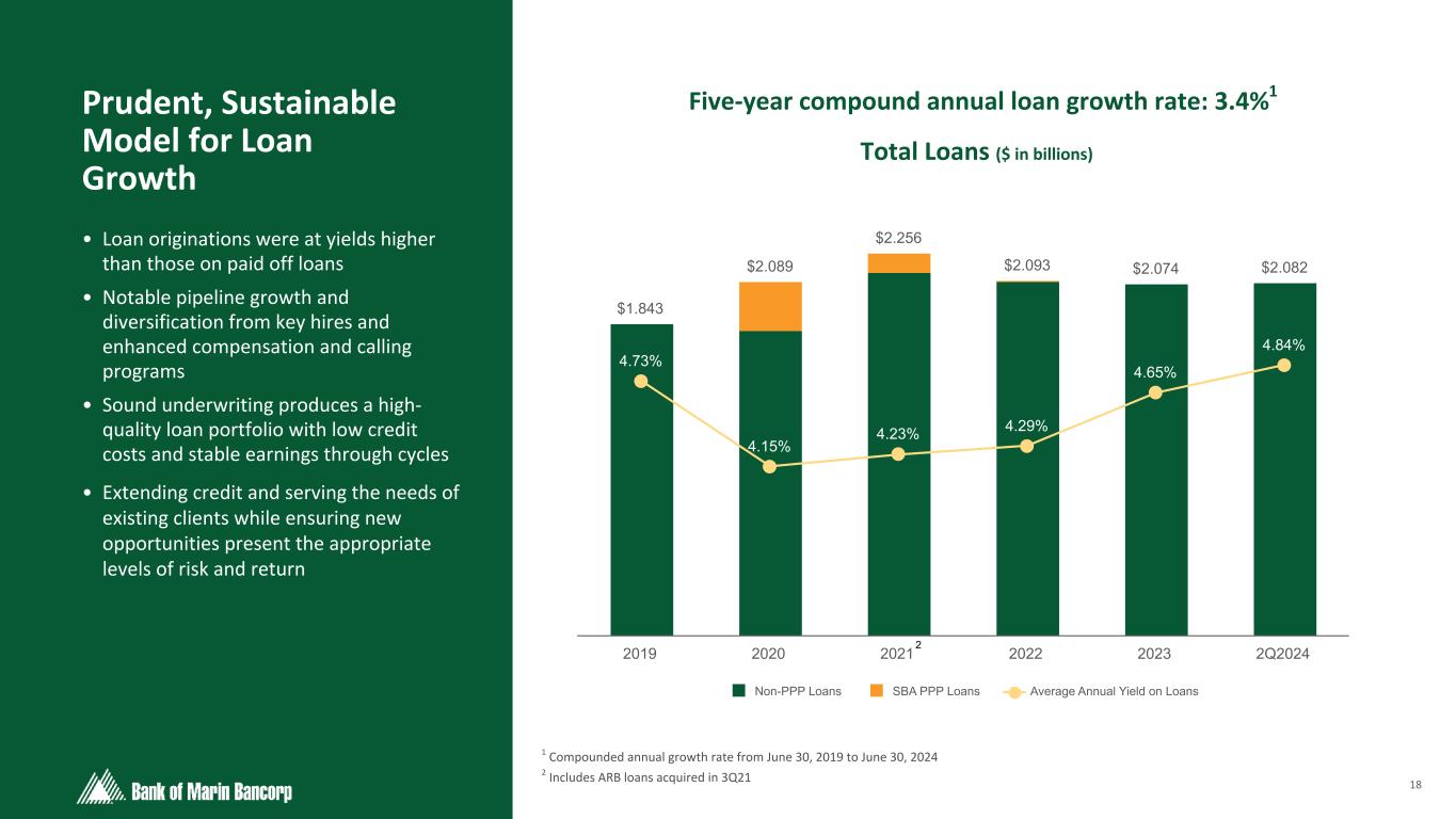 17 Text 95,96,96 Light Gray 232, 232, 232 Black 0, 0, 0 White 255, 255, 255 Accent 1 7,89,52 Accent 2 248,153,40 Accent 3 254,217,129 Accent 4 52,153,70 Accent 5 5,39,67 Accent 6 171,184,195 Strong Liquidity: $1.8 Billion in Net Availability • Immediately available contingent funding represented 202% of 6/30/24 estimated uninsured deposits • The Bank has long-established minimum liquidity requirements regularly monitored using metrics and tools similar to larger banks, such as the liquidity coverage ratio and multi-scenario, long-horizon stress tests • Deposit outflow assumptions for liquidity monitoring and stress testing are conservative relative to actual experience Liquidity & Uninsured Deposits ($ in millions) 2.0x Coverage Ratio At June 30, 2024 ($ in millions) Total Available Amount Used Net Availability Internal Sources Unrestricted Cash 1 $ 201.8 N/A $ 201.8 Unencumbered Securities 193.5 N/A 193.5 External Sources FHLB line of credit 941.7 $ — 941.7 FRB line of credit 335.4 — 335.4 Lines of credit at correspondent banks 125.0 — 125.0 Total Liquidity $ 1,797.4 $ — $ 1,797.4 1 Excludes cash items in transit Note: Access to brokered deposit purchases through networks such as Intrafi and Reich & Tang and brokered CD sales not included above $1,797.4 $889.8 Liquidity Est. Uninsured Deposits