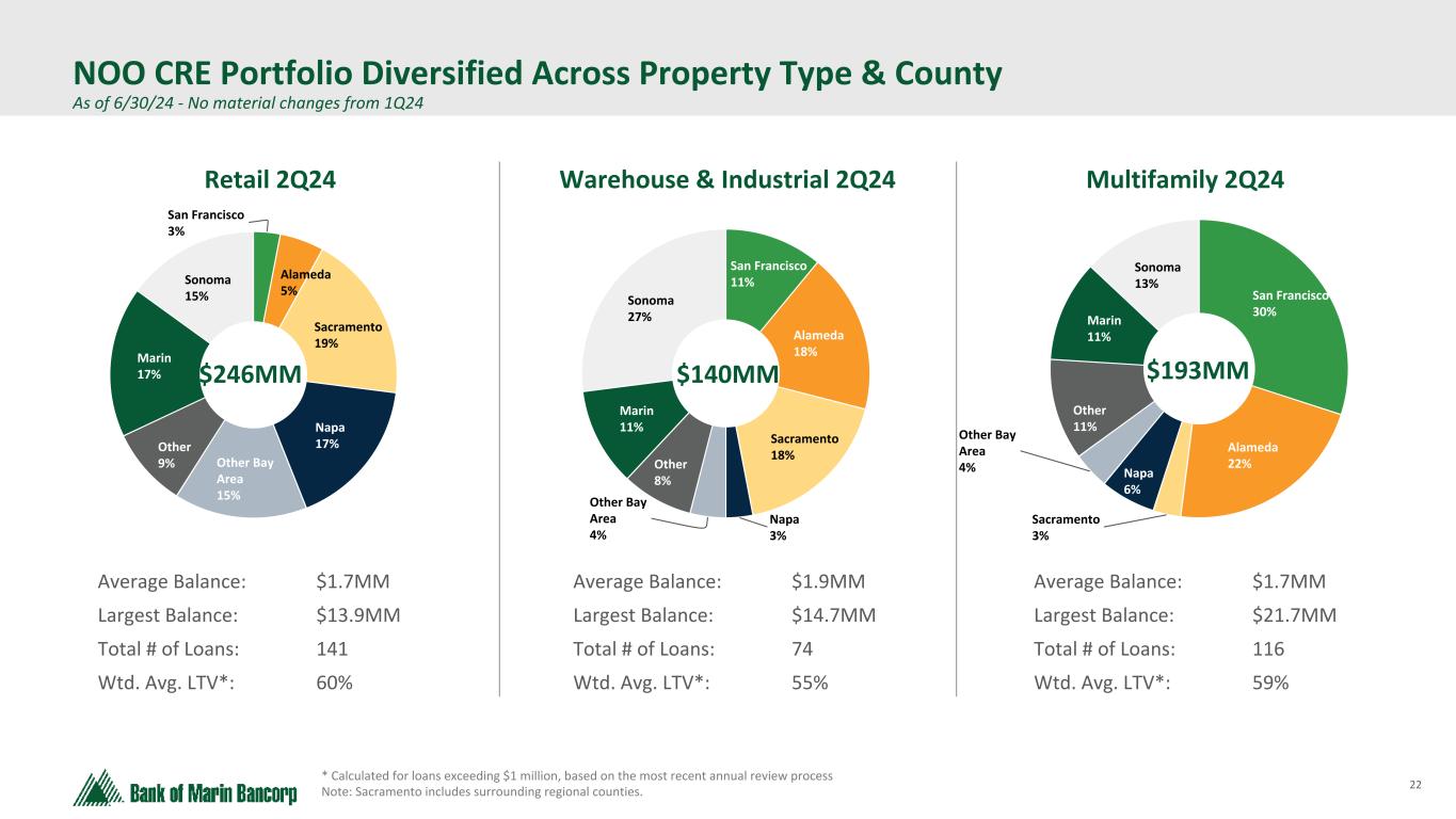 21 Text 95,96,96 Light Gray 232, 232, 232 Black 0, 0, 0 White 255, 255, 255 Accent 1 7,89,52 Accent 2 248,153,40 Accent 3 254,217,129 Accent 4 52,153,70 Accent 5 5,39,67 Accent 6 171,184,195 NOO CRE Office Portfolio by County * Calculated for loans exceeding $1 million, based on the most recent annual review process, and net of individual reserves Non-owner Occupied Office Exposure As of 6/30/24 - No material changes from 1Q24 San Francisco 19% Alameda 6% Sacramento 7% Napa 10% Other Bay Area 13% Other 4% Marin 24% Sonoma 17% $369MM City of S.F. NOO CRE Office Portfolio • $369 million in credit exposure spread across our lending footprint comprised of 150 loans • $2.5 million average loan balance – largest loan at $16.7 million • 63% weighted average loan-to-value and 1.55x weighted average debt-service coverage ratio* • City of San Francisco NOO CRE office exposure is 3% of total loan portfolio and 6% of total NOO CRE loans Total Balance: $70.2 million Average Loan Bal: $5.4 million Number of Loans: 13 loans Wtd. Average LTV*: 72% Wtd. Average DCR: 0.96x Average Occupancy: 77% 12 of the 13 loans are secured by low rise buildings and one loan is secured by a 10 story building