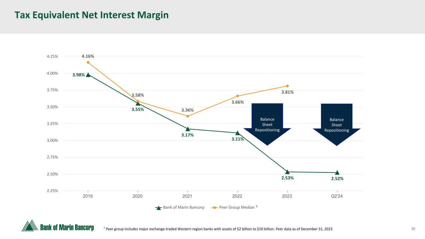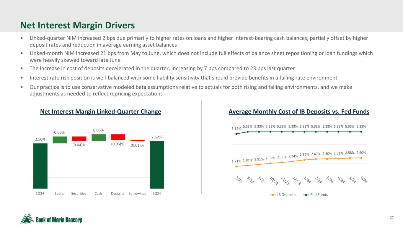 26 Text 95,96,96 Light Gray 232, 232, 232 Black 0, 0, 0 White 255, 255, 255 Accent 1 7,89,52 Accent 2 248,153,40 Accent 3 254,217,129 Accent 4 52,153,70 Accent 5 5,39,67 Accent 6 171,184,195 3.98% 3.55% 3.17% 3.11% 2.53% 2.52% 4.16% 3.58% 3.36% 3.66% 3.81% Bank of Marin Bancorp Peer Group Median 2019 2020 2021 2022 2023 Q2'24 2.25% 2.50% 2.75% 3.00% 3.25% 3.50% 3.75% 4.00% 4.25% Tax Equivalent Net Interest Margin 1 Peer group includes major exchange-traded Western region banks with assets of $2 billion to $10 billion. Peer data as of December 31, 2023 Balance Sheet Repositioning 1 Balance Sheet Repositioning