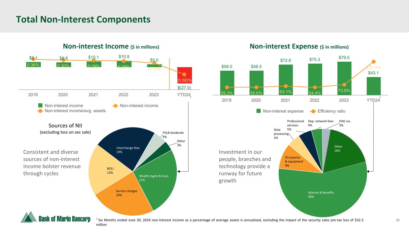 28 Text 95,96,96 Light Gray 232, 232, 232 Black 0, 0, 0 White 255, 255, 255 Accent 1 7,89,52 Accent 2 248,153,40 Accent 3 254,217,129 Accent 4 52,153,70 Accent 5 5,39,67 Accent 6 171,184,195 Loans & Securities — Repricing & Maturity $ in millions, unless otherwise indicated Total Loans1 * at June 30, 2024 Repricing Term Rate Structure 3 mo or less 3-12 mos 1-3 years 3-5 years 5-15 years Over 15 years Total Floating Rate Variable Rate Variable Rate at Floor or Ceiling Fixed Rate C&I $ 90.6 $ 5.5 $ 12.2 $ 34.5 $ 23.8 $ 2.6 $ 169.2 $ 70.4 $ 18.7 $ 6.6 $ 73.5 Real estate: Owner-occupied CRE 3.7 9.4 38.9 64.1 201.9 7.1 325.1 0.1 35.0 103.0 187.0 Non-owner occupied CRE 54.6 41.5 232.1 273.7 652.8 13.2 1,267.9 7.7 103.7 336.8 819.7 Construction 42.0 5.0 4.2 — — — 51.2 1.5 — 15.0 34.7 Home equity 87.3 — — — 0.7 — 88.0 87.3 — — 0.7 Other residential 0.3 7.1 — 0.6 1.5 104.6 114.1 — 7.7 105.1 1.3 Installment & other consumer 1.6 2.4 7.9 3.3 51.7 — 66.9 0.6 8.8 7.5 50.0 Total $ 280.1 $ 70.9 $ 295.3 $ 376.2 $ 932.4 $ 127.5 $ 2,082.4 $ 167.6 $ 173.9 $ 574.0 $ 1,166.9 % of Total 14 % 3 % 14 % 18 % 45 % 6 % 100 % 8 % 8 % 28 % 56 % Weighted Average Rate 7.80 % 5.44 % 4.77 % 5.13 % 4.25 % 3.93 % 4.99 % 1 Amounts represent amortized cost. Based on maturity date for fixed rate loans and variable rate loans at their floors and ceilings and next repricing date for all other variable rate loans. Does not included prepayment assumptions. Investment Securities2 * at June 30, 2024 2 Includes both available-for-sale and held-to-maturity investment securities with prepayment assumptions applied. Maturity & Projected Cash Flow Distribution 3 mo or less 3-12 mos 1-3 years 3-5 years 5-10 years Over 10 years Total Principal (par) & interest $ 27.5 $ 93.3 $ 260.9 $ 209.1 $ 512.2 $ 291.8 $ 1,394.8 % of Total 2 % 7 % 19 % 15 % 36 % 21 % 100 %