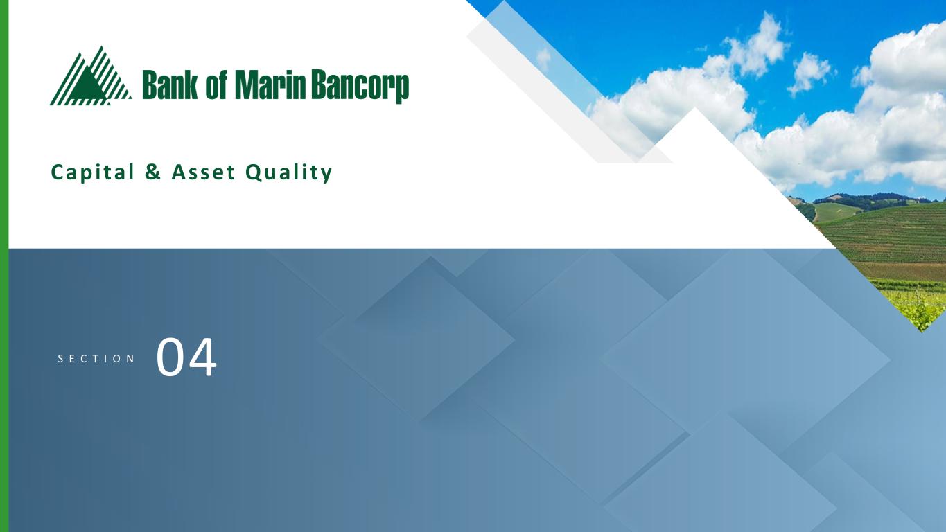 24 Text 95,96,96 Light Gray 232, 232, 232 Black 0, 0, 0 White 255, 255, 255 Accent 1 7,89,52 Accent 2 248,153,40 Accent 3 254,217,129 Accent 4 52,153,70 Accent 5 5,39,67 Accent 6 171,184,195 ($ in millions at Fair Value) * Loan-to-value largely based on appraised values at origination, or updated appraisals for certain high dollar or classified loans and, balances as of 6/30/24 Construction Portfolio Concentrations As of 6/30/24 Construction by Type 2Q24 Construction by County 2Q24 Multi-Family 61% 1-4 Residential 37% Land & Ag. 2% San Francisco 77% Napa 2% Other Bay Area 6% Marin 13% Sonoma 2% Average Balance: $3.6MM Largest Loan: $12.8MM Wtd. Avg. LTV*: 72% Total Balance: $50.2MM Unfunded Commitments: $13.0MM Total Loans: 14 $50MM $50MM • Construction loans decreased by a net $20.3 million since 1Q24 from one large project completion • The payoff was in a county other than San Francisco, increasing the allocation to 77% from 62%, but no additional dollar exposure in San Francisco