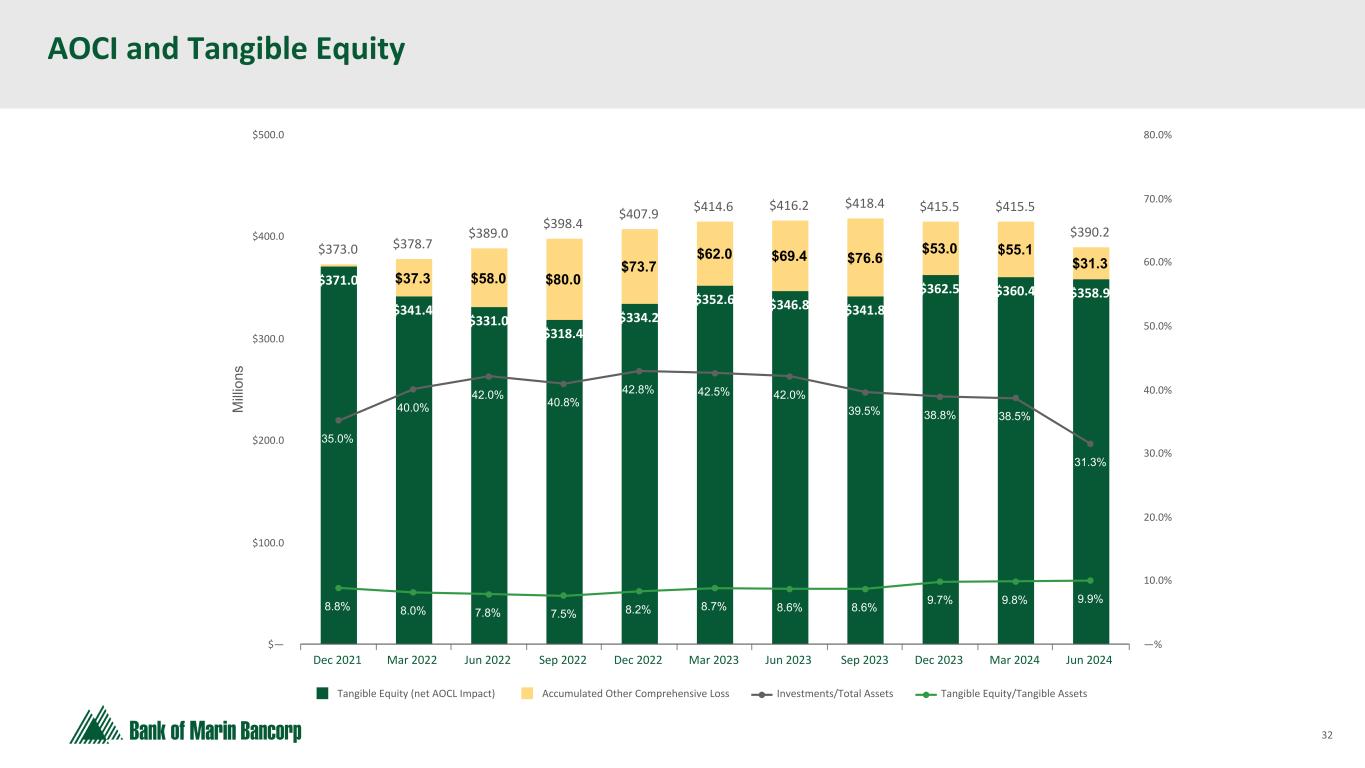 31 Text 95,96,96 Light Gray 232, 232, 232 Black 0, 0, 0 White 255, 255, 255 Accent 1 7,89,52 Accent 2 248,153,40 Accent 3 254,217,129 Accent 4 52,153,70 Accent 5 5,39,67 Accent 6 171,184,195 ($ in millions at Fair Value) History of Strong Asset Quality Non-accrual Loans / Total Loans Quarterly Progression 0.10% 0.27% 0.39% 0.31% 1.62% 2Q23 3Q23 4Q23 1Q24 2Q24 • Allowance for credit losses to total loans of 1.47%, up from 1.24% last quarter • Non-accrual balances increased largely due to one $16.7 million NOO CRE loan which moved to non-accrual as management believes there is substantial doubt as to the collection or refinance of the principal amount of the loan at maturity based on the current collateral value and borrower creditworthiness. We expect payments to remain current through maturity from cash collateral. Individual reserve was increased as well, largely causing the $5.2 million provision. • Consistent, robust credit culture and underwriting principles support strong asset quality • Net charge-offs have consistently been negligible for the last five years due to strong underwriting fundamentals, except that in 4Q23 charge-offs included $406 thousand charged to the allowance due to the sale of an acquired loan. Non-accrual Loans / Total Loans $9,233 $8,376 $2,432 $7,992 $33,679 0.44% 0.37% 0.12% 0.39% 1.62% Non-accrual Non-accrual/Total loans 2020 2021 2022 2023 2Q24
