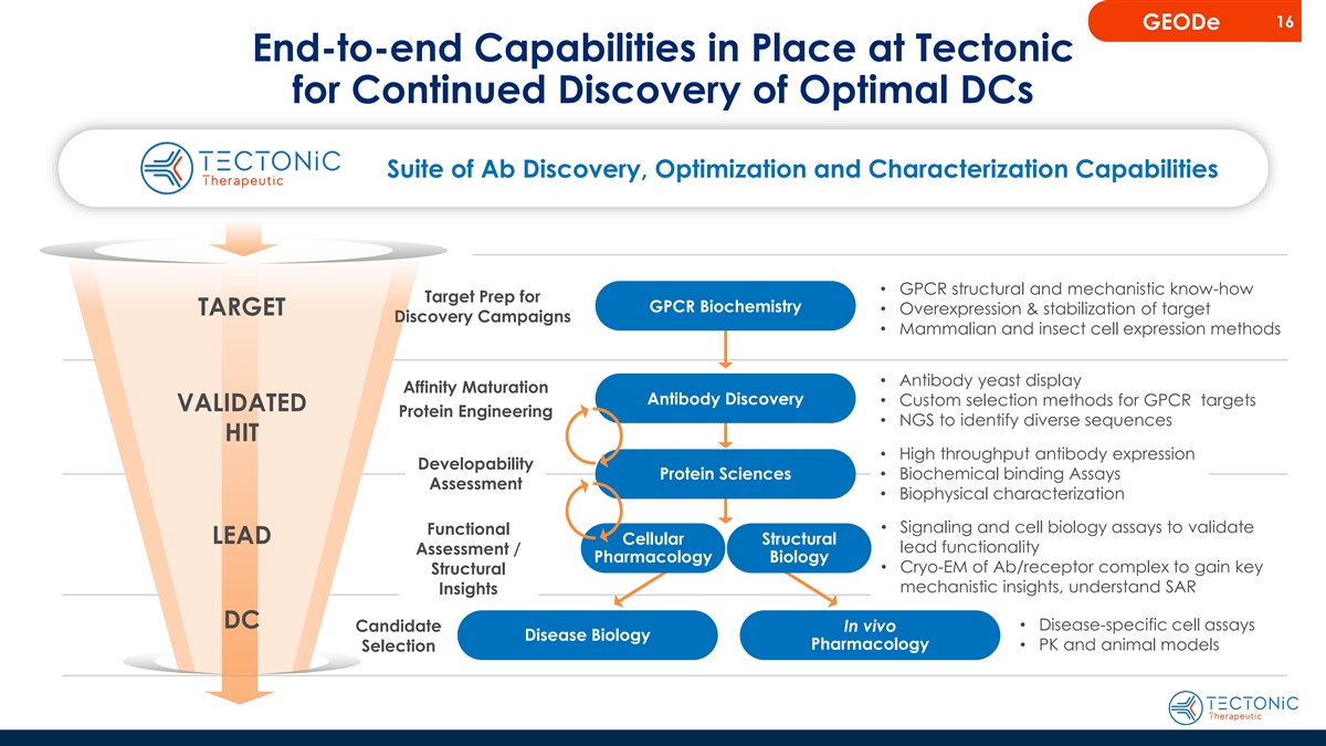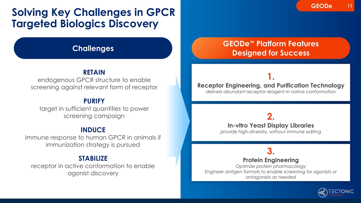 10 GEODe PLATFORM Proprietary, validated platform, enables reproducible discovery and optimization of GPCR targeted biologics