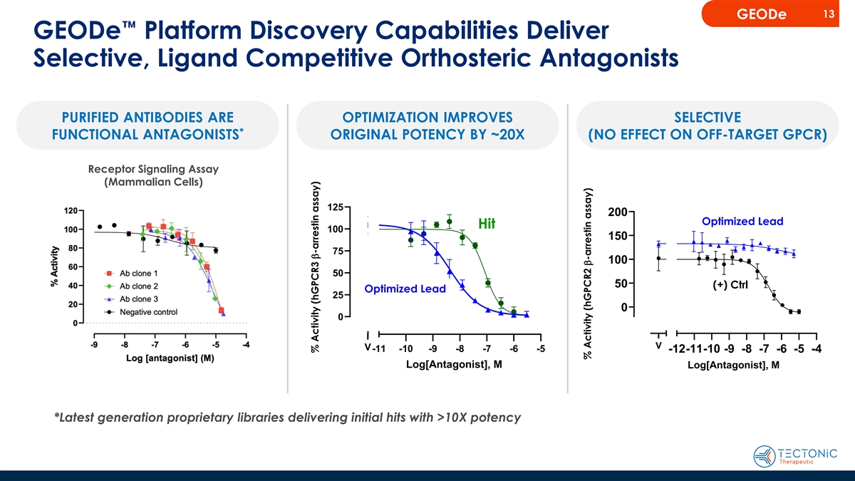 12 GEODe Proprietary GEODe platform spans three enabling technologies to identify and optimize potent GPCR targeted biologics 1. 2. 3. EXPRESSION AND IN-VITRO YEAST PROTEIN ENGINEERING PURIFICATION TECHNOLOGY DISPLAY LIBRARIES • Optimize Protein Pharmacology Produce Sufficient Quantities Efficiently Screen • Engineer Proprietary Scaffolds and Stabilize Them in the Diverse Antibody Libraries for Agonist Discovery Correct Conformation Against GPCRs Large toolbox of biochemical methods, engineering tools, and assays