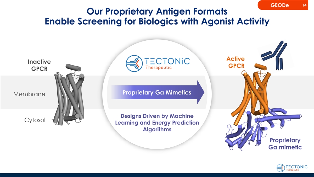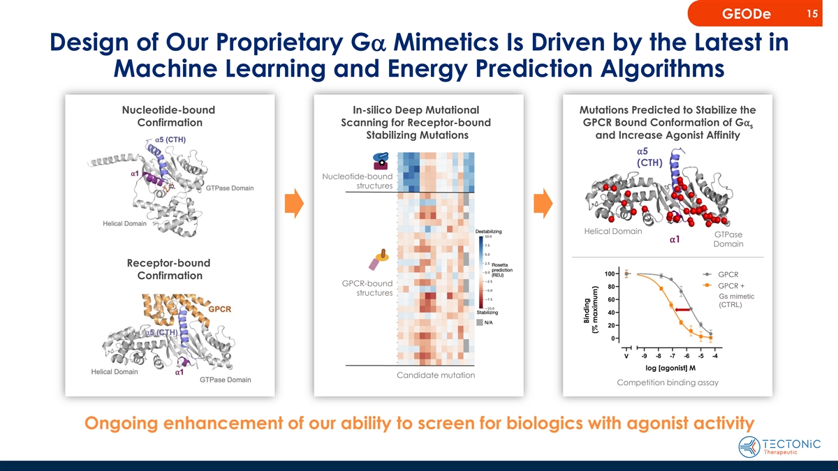 14 GEODe Our Proprietary Antigen Formats Enable Screening for Biologics with Agonist Activity Active Inactive GPCR GPCR Proprietary Ga Mimetics Membrane Designs Driven by Machine Cytosol Learning and Energy Prediction Algorithms Proprietary Gα mimetic